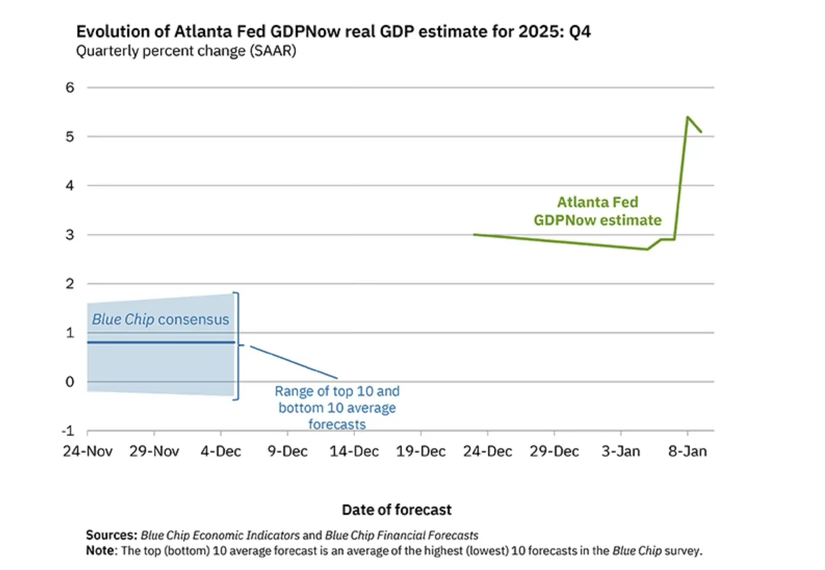 C’est un signal positif pour l’économie, qui, selon le modèle GDPNow de la Réserve fédérale d’Atlanta, connaît actuellement une croissance rapide. Les dernières estimations du modèle prévoient une croissance économique de 5,1 % pour le quatrième trimestre 2025, après une croissance solide de 4,3 % au troisième trimestre.
