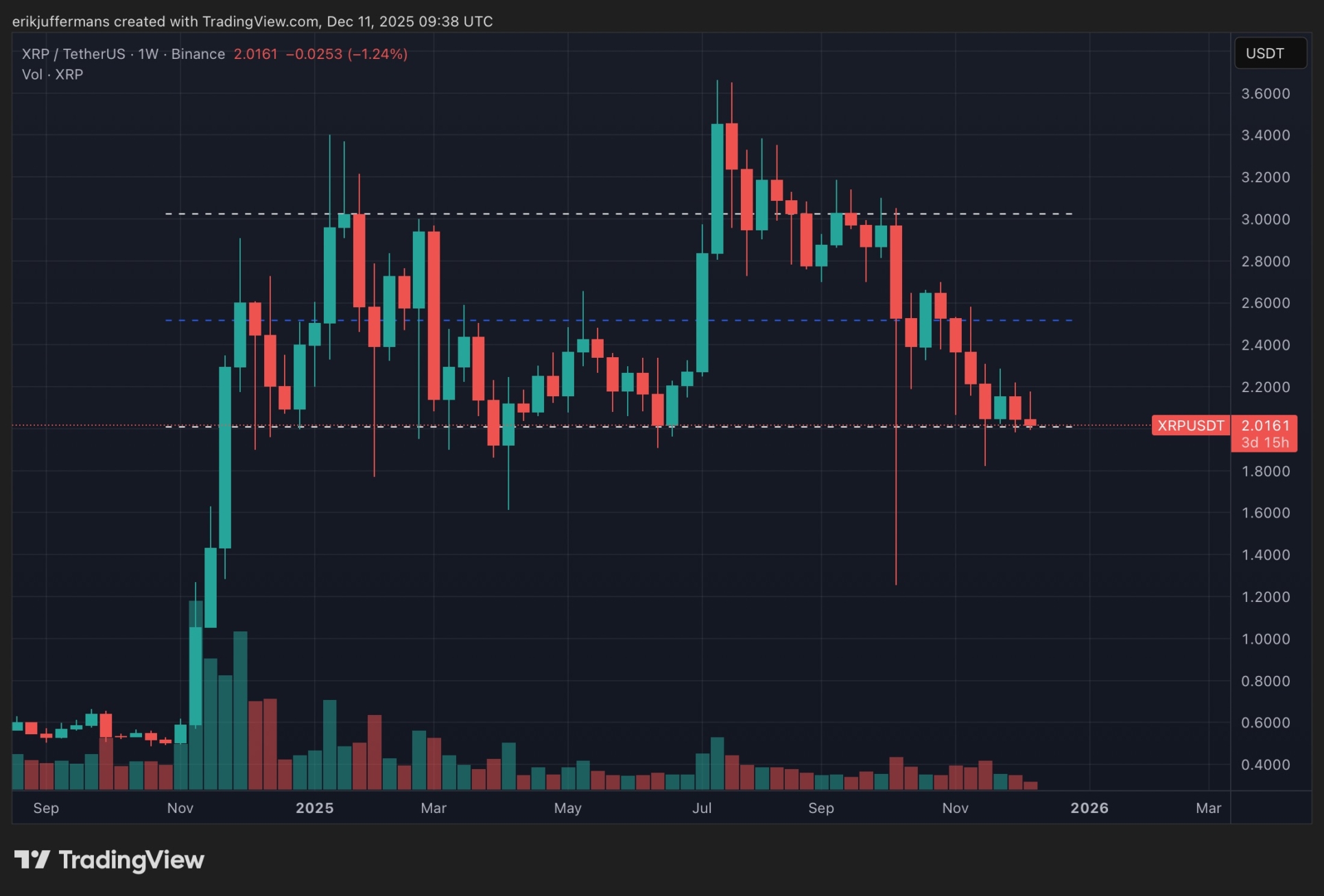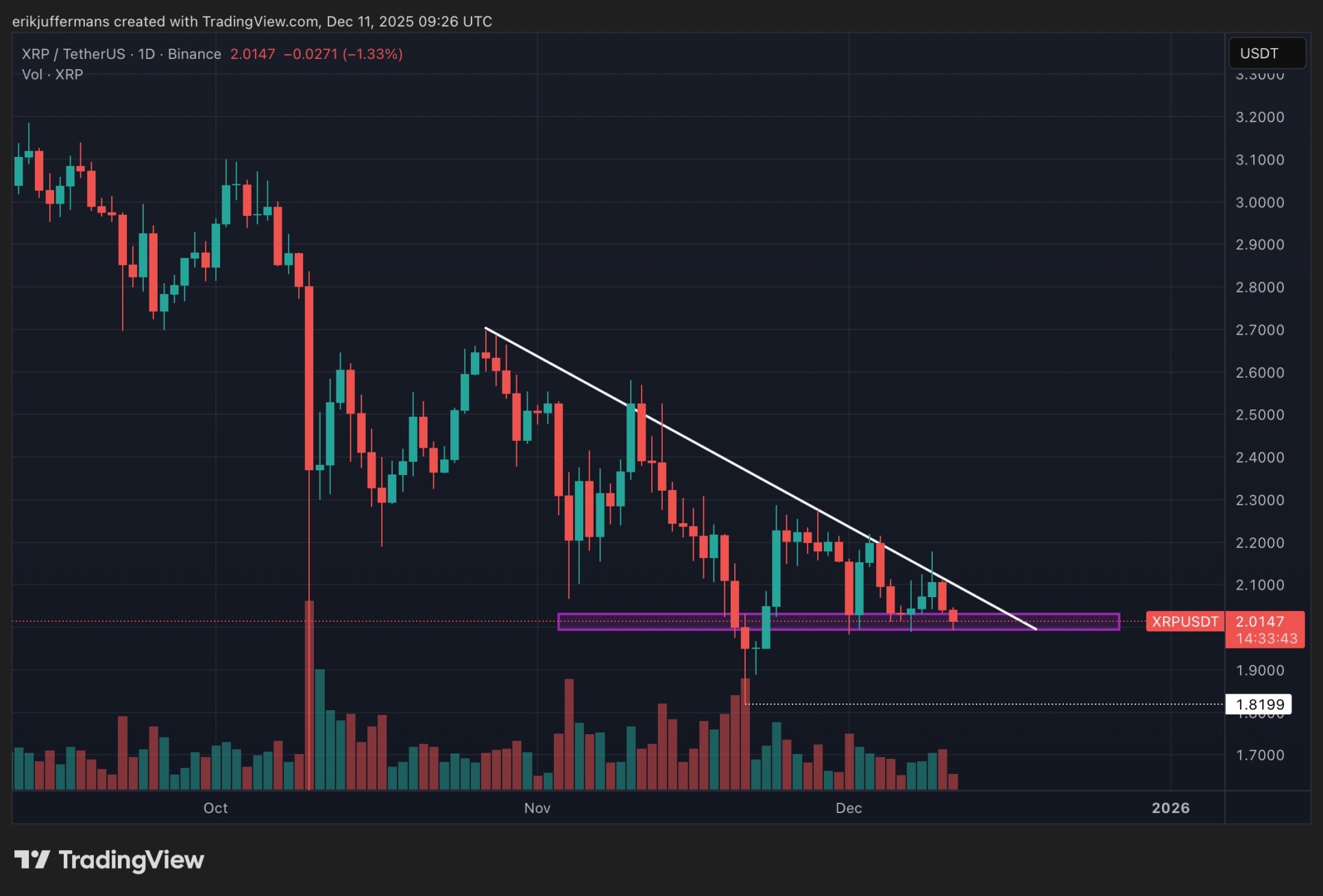 Au moment de la rédaction, le XRP se négocie à environ 2,02 dollars. Une clôture en dessous de ce niveau ouvrirait la voie à une baisse vers 1,82 dollar, où se situe le prochain support significatif.