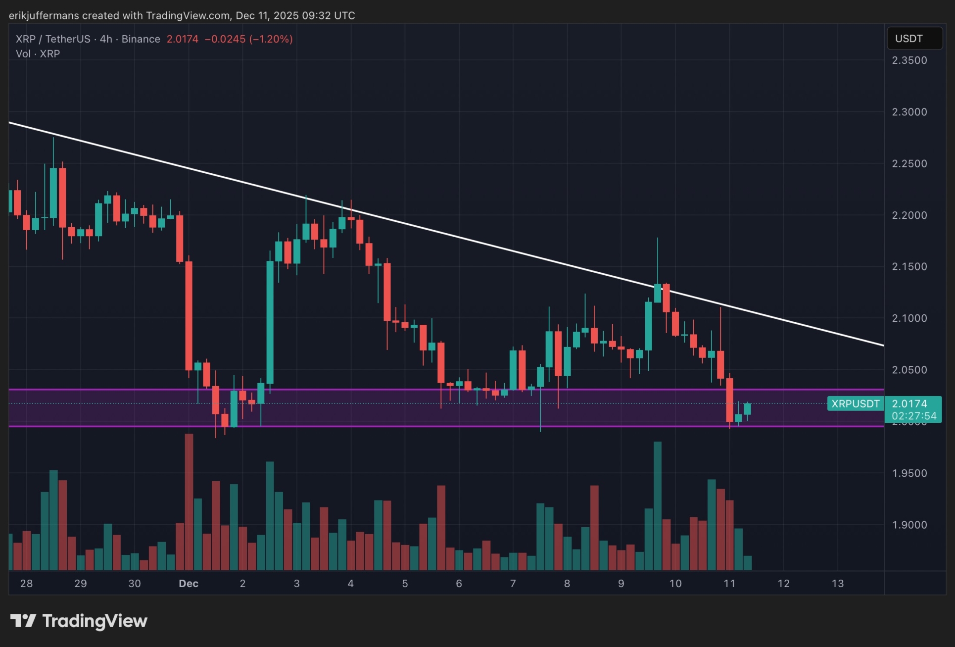 Malgré le tableau technique négatif, les haussiers ne cèdent pas si facilement. Sur le graphique en 4 heures, on peut voir que le XRP a trouvé de nouveau un support précis à 2 dollars cette nuit, ce qui indique un fort intérêt d’achat à ce niveau.