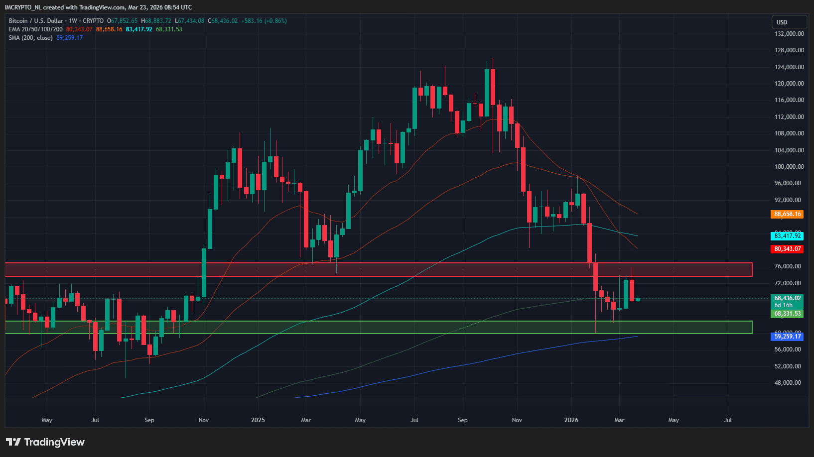 Hier, la clôture s’est faite à 67 850 dollars, ramenant le Bitcoin sous la moyenne mobile exponentielle à 200 semaines (la ligne verte) autour de 68 400 dollars. Ainsi, Bitcoin n’a clôturé qu’une seule bougie hebdomadaire au-dessus de cette ligne.