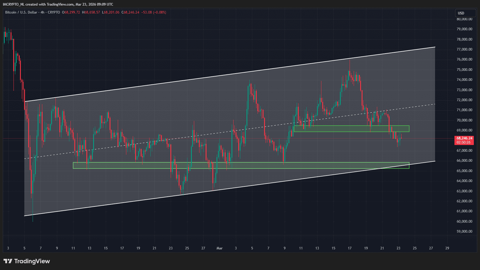Nous examinons d’abord le graphique le plus préoccupant : l’affichage hebdomadaire. On constate que Bitcoin a été nettement rejeté par la zone de résistance rouge, qui offrait un soutien l’année dernière en avril. Après avoir atteint un pic de 76 000 dollars lundi soir, le cours a chuté de plus de 11 %.