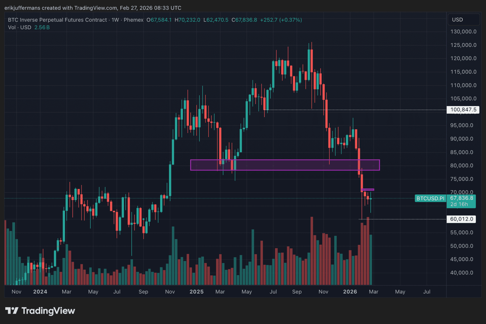 Nous devrons observer comment le cours réagit à ce niveau. Un franchissement de cette zone serait un bon signal. Mais le véritable test est légèrement plus élevé, autour de 80 000 dollars. Ce niveau a précédemment servi de support. Lorsque ce support a été perdu, le cours a rapidement chuté vers 60 000 dollars. Une reprise de cette zone serait donc significative.