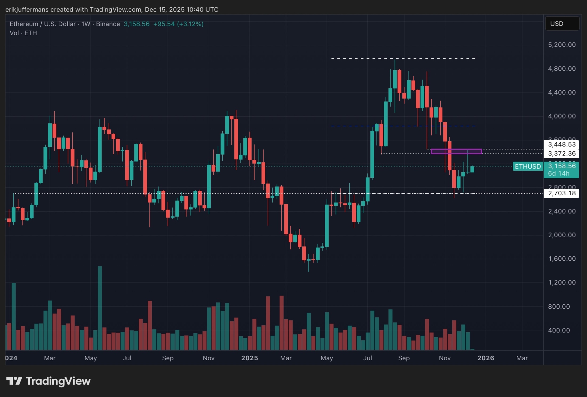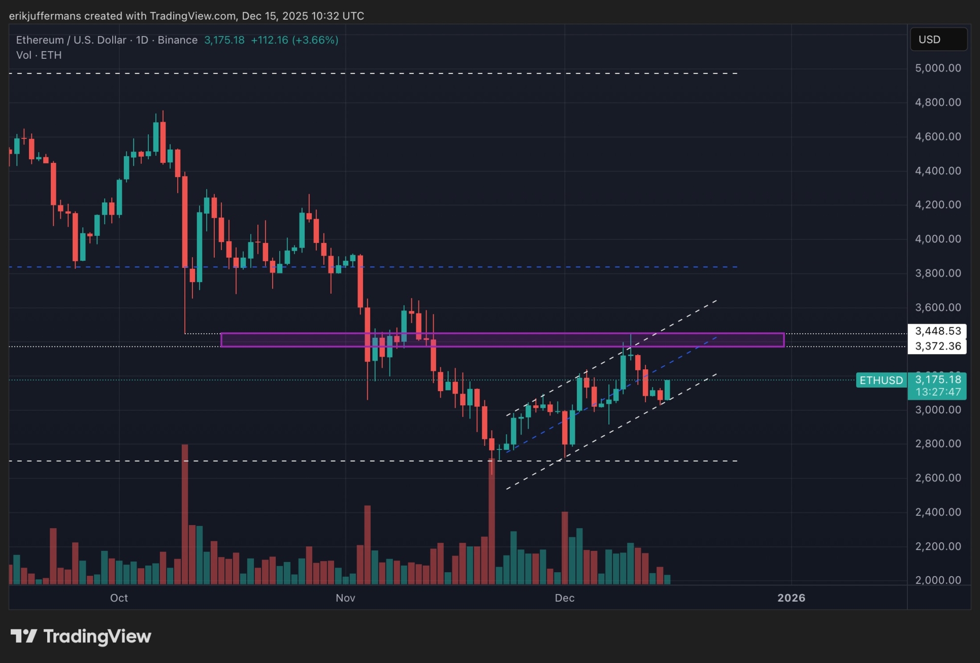 Examinons maintenant le graphique ETH lui-même. Sur le graphique quotidien de l’ETH, nous voyons que le cours a grimpé mercredi dernier à 3 440 dollars, avant d’être rejeté à ce niveau. Ce niveau correspond précisément au plancher du grand krach crypto du 10 octobre.