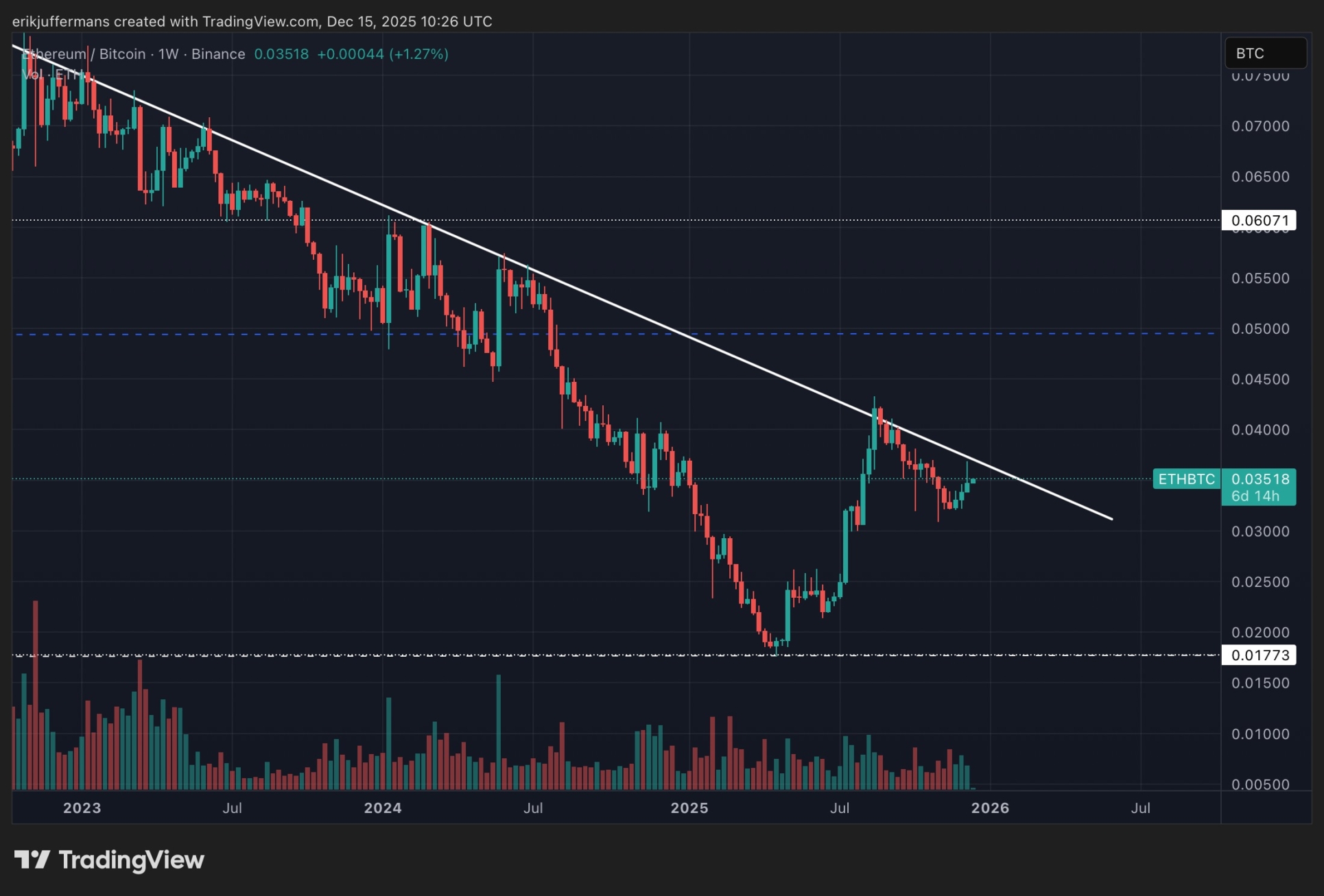 Pour la quatrième semaine consécutive, Ethereum surpasse Bitcoin, comme le montre le graphique ETH/BTC ci-dessous. Depuis avril de cette année, ETH gagne du terrain par rapport à BTC, et après quelques mois de ralentissement, ETH reprend l’initiative. Le cours se rapproche même d’un niveau de résistance diagonal qui est un obstacle depuis des années.