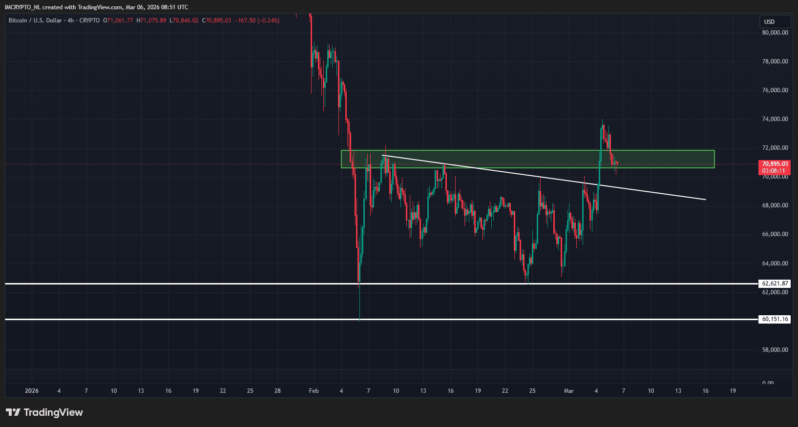Désormais, les 71 000 dollars sont de nouveau à portée de main, ce qui signifie que le support vert joue toujours son rôle. Toutefois, si le bitcoin tombe sous les 70 000 dollars, il faudra surveiller la ligne de tendance blanche qui se situe actuellement autour de 69 000 dollars.