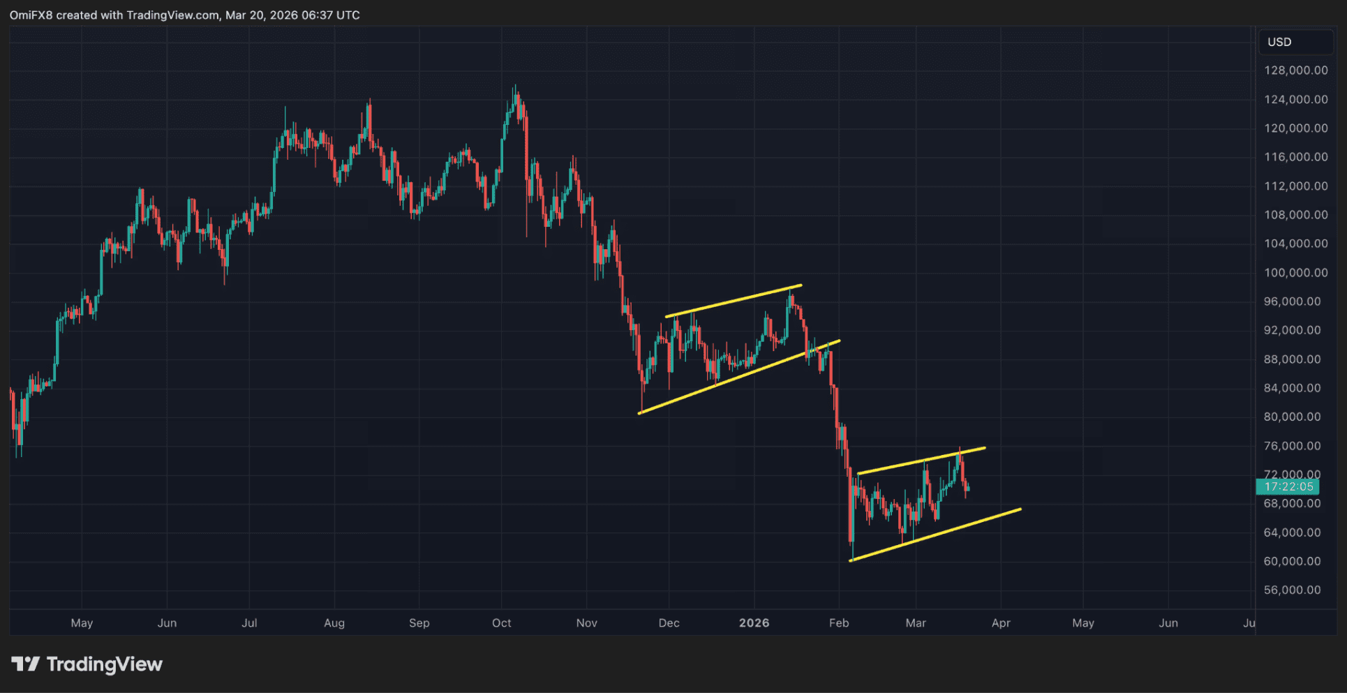 Depuis début février, le cours évolue dans un canal légèrement haussier, après une chute précédente vers 60 000 dollars. À première vue, cela semble être un signe de reprise, mais selon l’analyse technique, il s’agirait plutôt d’une remontée temporaire au sein d’une tendance générale à la baisse.