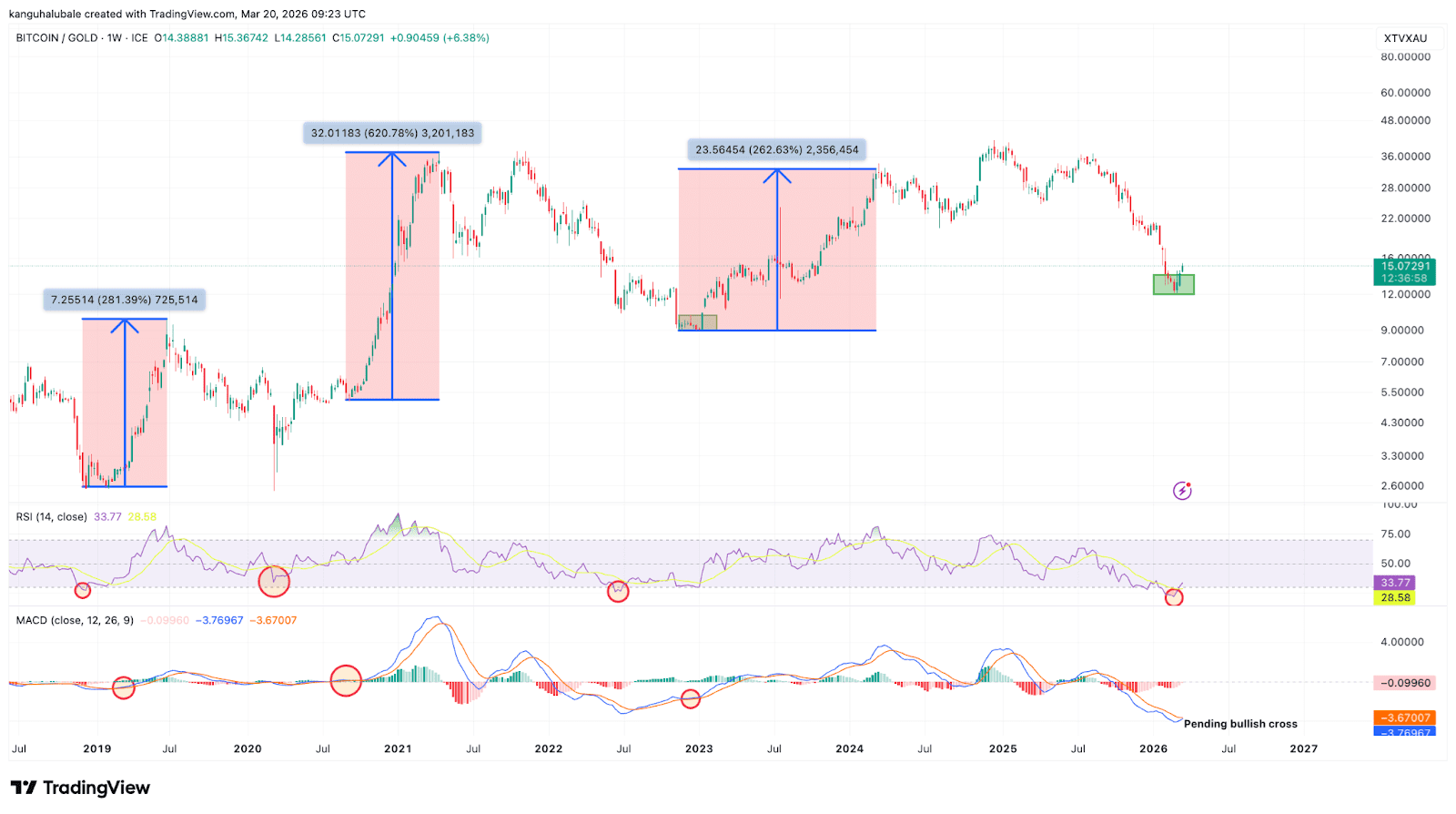 L’analyste néerlandais Ted Pillows observe un schéma similaire. Selon lui, Bitcoin évolue face à l’or selon le même cycle depuis des années. Après une baisse d’environ quatorze mois, un creux est souvent suivi d’une reprise du cours. Cela s’est produit en 2014, 2018 et 2022.