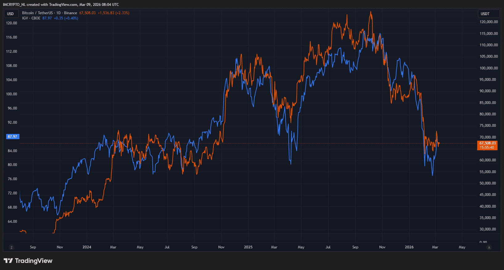 Le cours du Bitcoin présente récemment des similitudes frappantes avec les actions de logiciels. Cela est particulièrement évident lorsque le prix de Bitcoin est comparé à l’iShares Expanded Tech-Software Sector ETF (ticker : IGV), un fonds indiciel qui suit de grandes entreprises de logiciels comme Microsoft et Adobe.