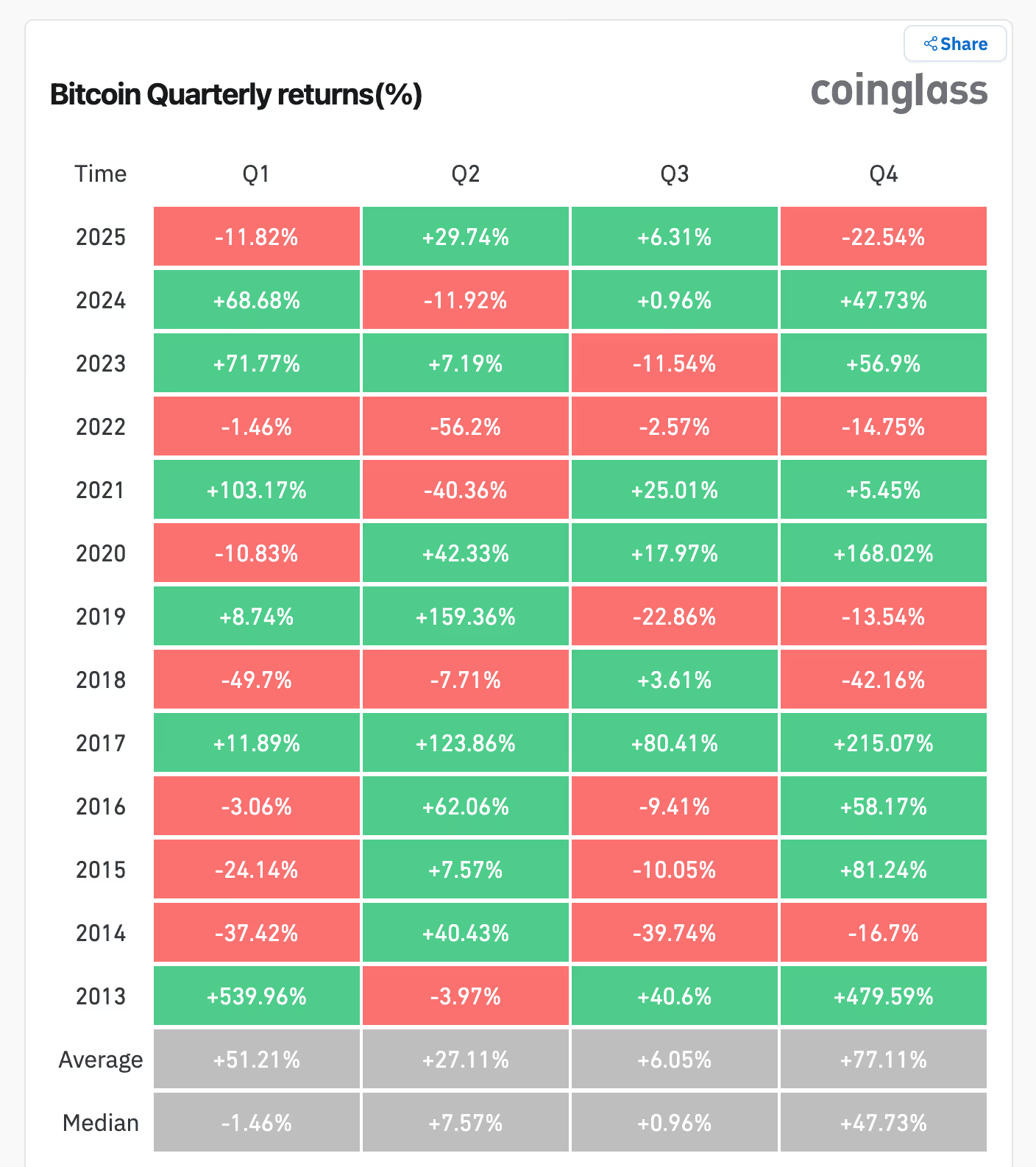 Selon les données de CoinGlass, le Bitcoin est en baisse de plus de 22 % ce trimestre. Ainsi, 2025 se démarque nettement du schéma historique, où le quatrième trimestre était souvent l’une des périodes les plus fortes pour la plus grande cryptomonnaie.