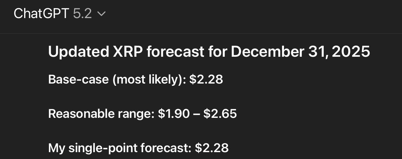 Que peut-on donc vraiment attendre ? Finbold a posé la question à ChatGPT 5.2, le dernier modèle d’IA d’OpenAI. La mission : fournir une prévision réaliste pour le cours du XRP au 31 décembre 2025.