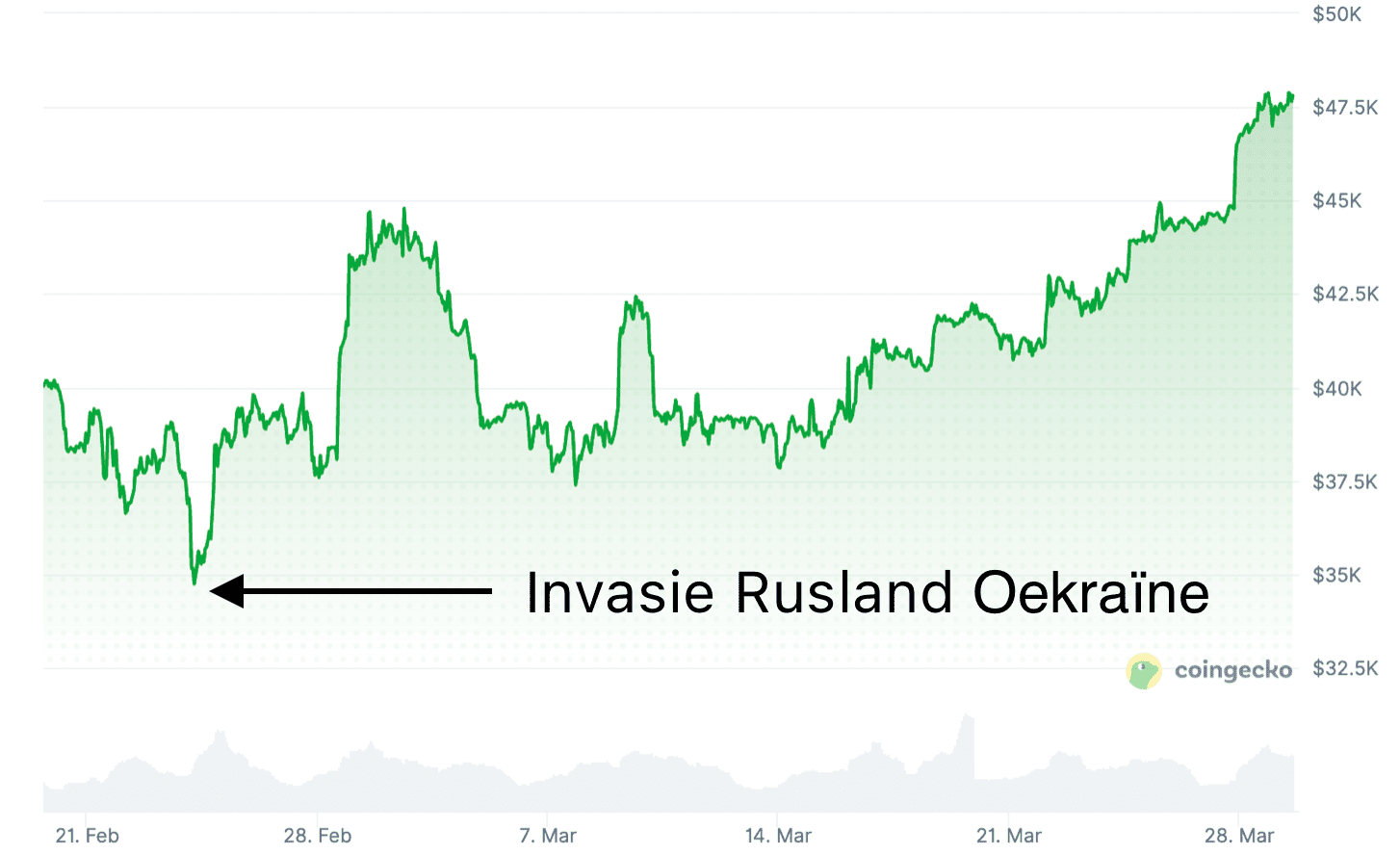 Cela s’est illustré lors de l’invasion russe en Ukraine en février 2022. Peu après le début de la guerre, le cours du Bitcoin est passé d’environ 39 000 dollars à environ 34 300 dollars, soit une baisse de près de treize pour cent en peu de temps.
