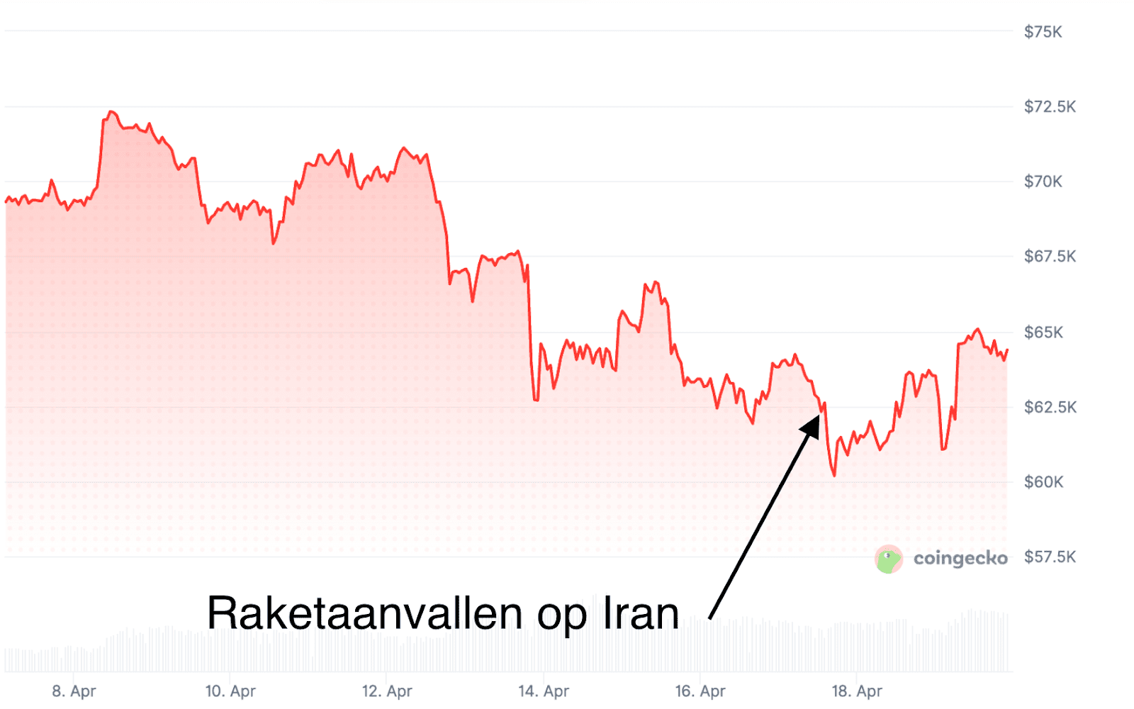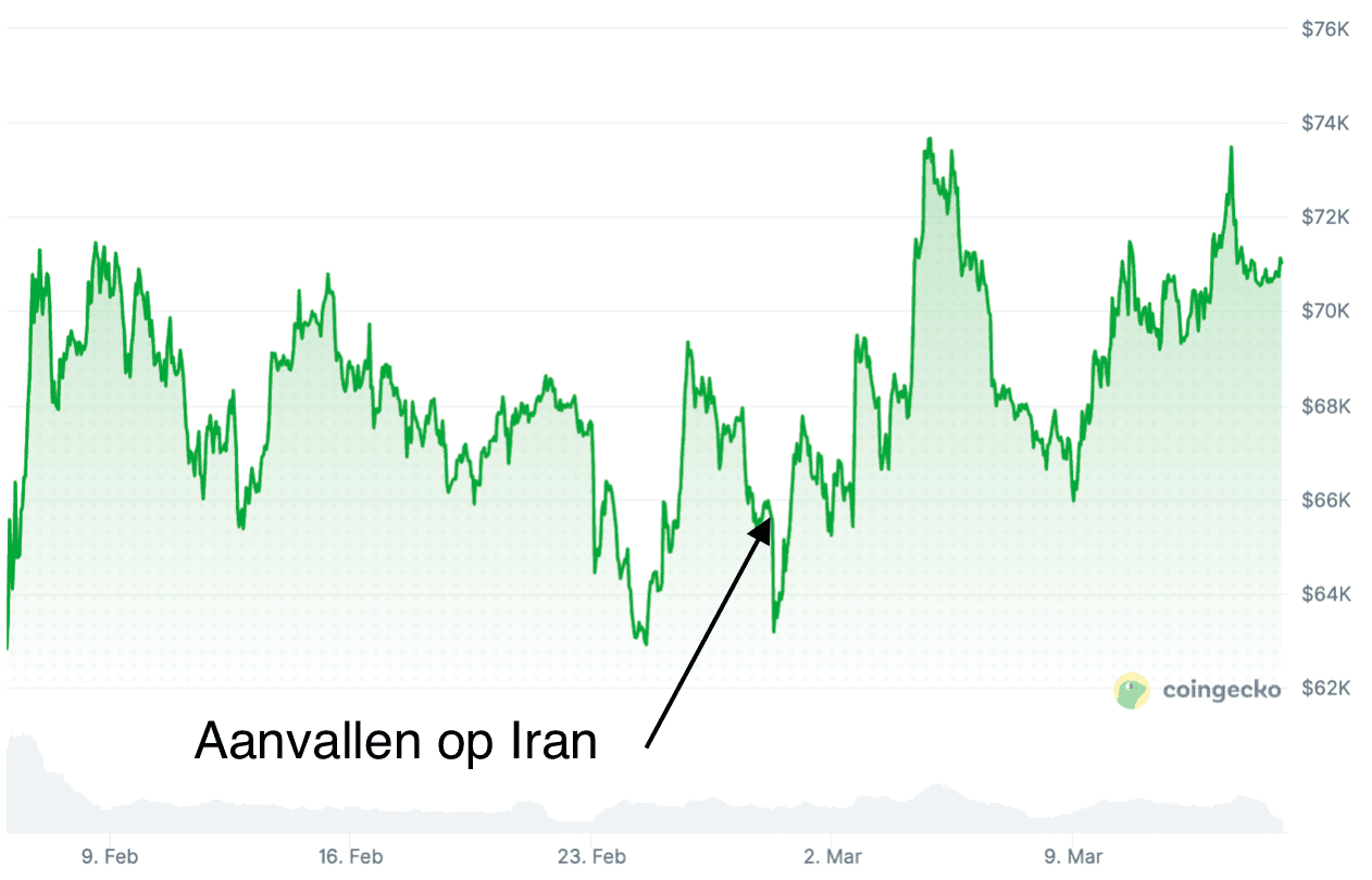 Le récent schéma s’est encore confirmé fin février. Juste avant les attaques d’Israël et des États-Unis sur l’Iran, le cours du Bitcoin était autour de 68 000 dollars. Peu après, le prix a chuté à environ 63 000 dollars, soit une baisse de plus de sept pour cent.