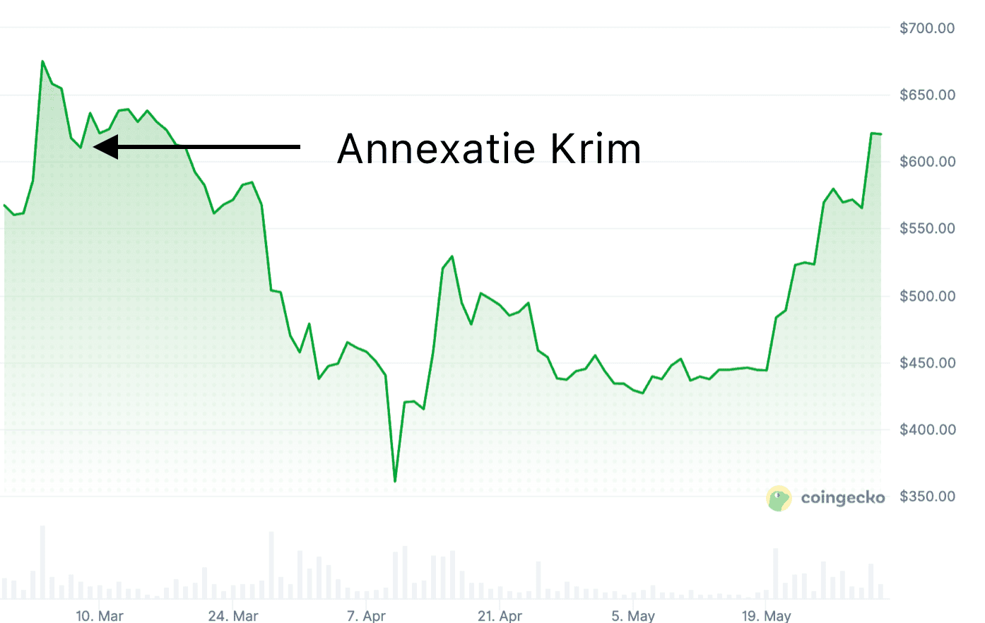 Après l’annexion de la Crimée en 2014, une chute similaire a été observée. En environ trois semaines, le Bitcoin est passé d’environ 610 dollars à environ 360 dollars, enregistrant une baisse de près de 41 pour cent.