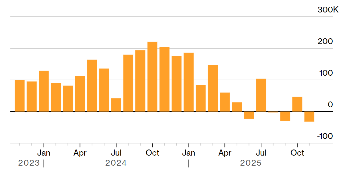 Ces derniers mois, toutefois, le marché de l’emploi perd en vigueur, ce qui suscite des interrogations. Pour le mois de novembre, le rapport sur l’emploi ADP fait état d’une baisse de 32 000 postes dans le secteur privé. Il s’agit clairement d’un signe de contraction du marché du travail américain.