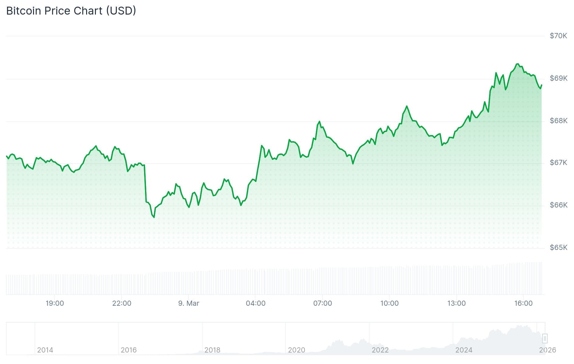 Bitcoin attire aujourd’hui toute l’attention sur les marchés financiers. Tandis que tout est dans le rouge, la monnaie orange a enregistré une hausse de 5,3 %. Le cours est passé de 66 000 dollars à un pic de 69 500 dollars.