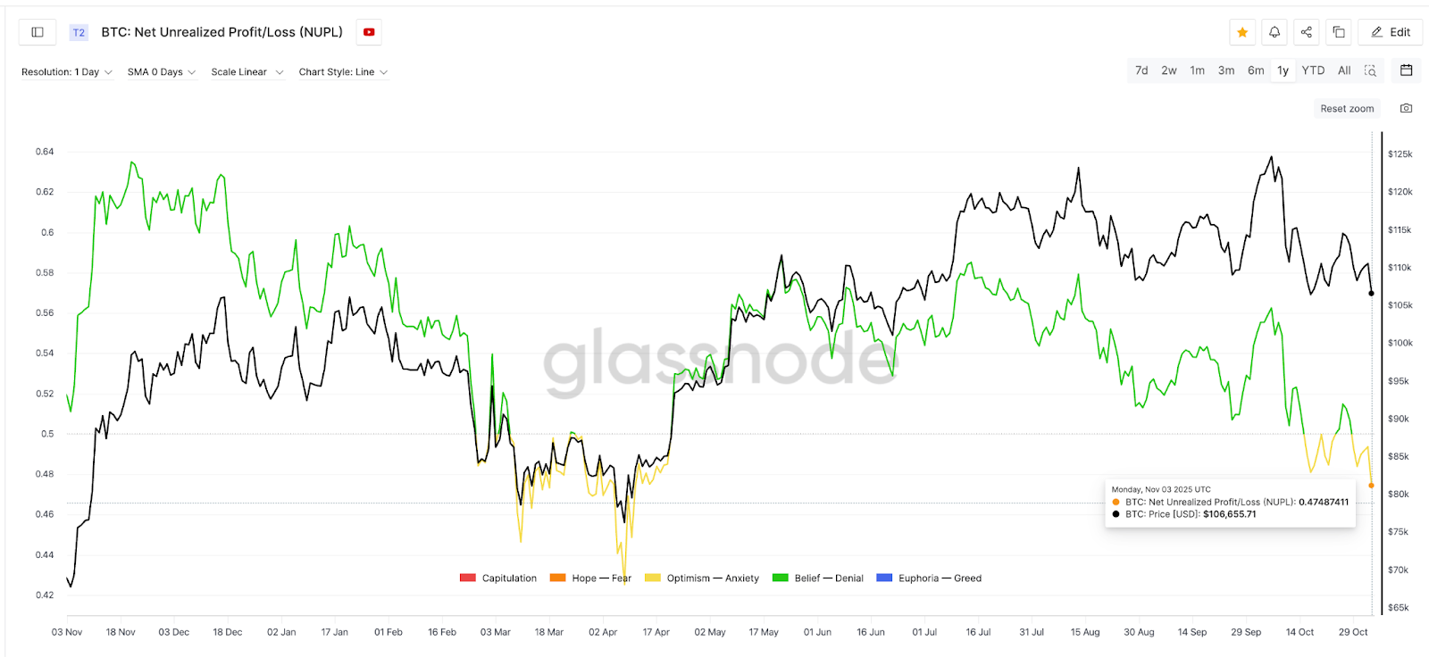 Un indicateur marquant est le Net Unrealized Profit/Loss (NUPL), qui s’établit à 0,47: son plus bas depuis avril. Cet indicateur mesure les profits latents des investisseurs. Un score faible signifie que beaucoup d’investisseurs ont peu de gains et ne cèdent donc pas facilement à la panique.