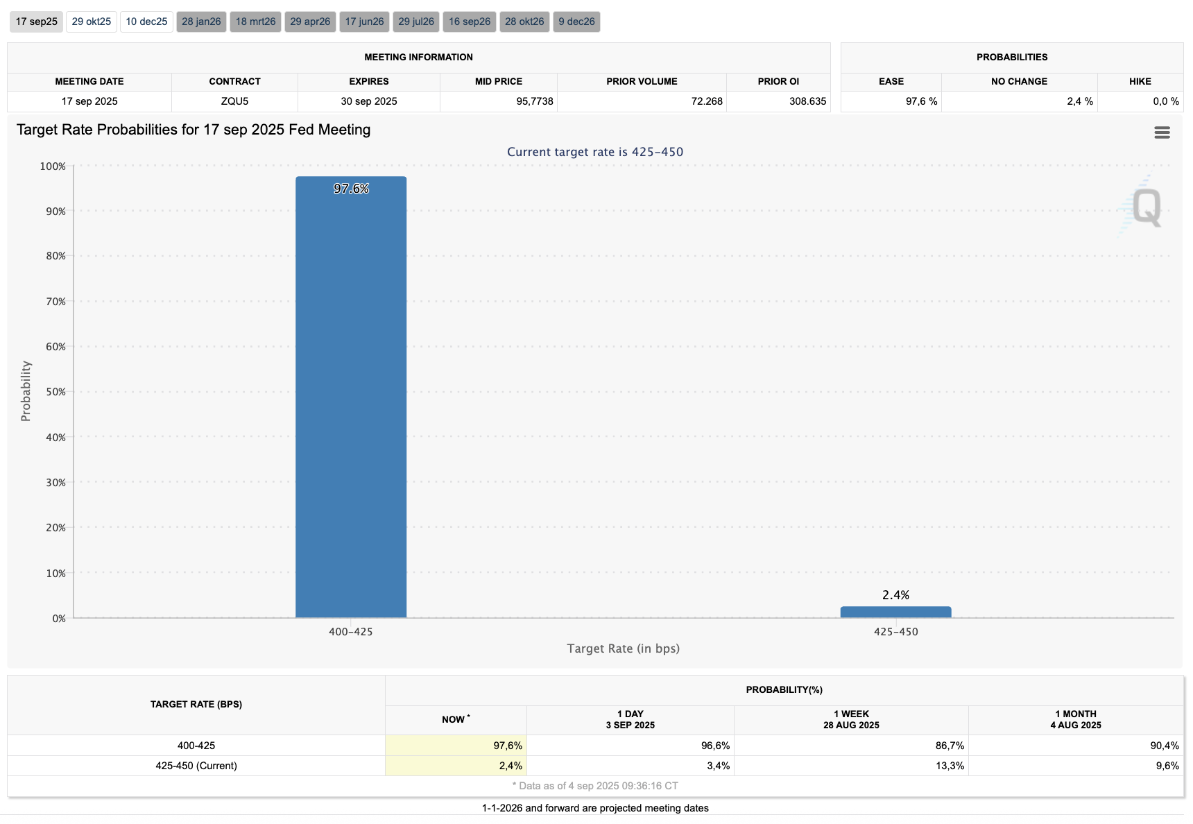 Pour ce mois-ci, il semble que Trump obtiendra ce qu’il veut, car la probabilité d’une baisse le 17 septembre est désormais presque de 100 pour cent.