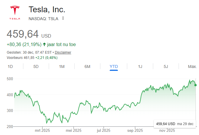 Début janvier, l’action Tesla se situait autour de 379 dollars. Quiconque a investi 1 000 dollars à cette époque a acheté environ 2,64 actions. Fin décembre, l’action a clôturé à 459,64 dollars. Cela représente un gain de plus de 81 dollars par action, soit un total de 214 dollars. Pas mal, surtout compte tenu de la turbulence du marché.