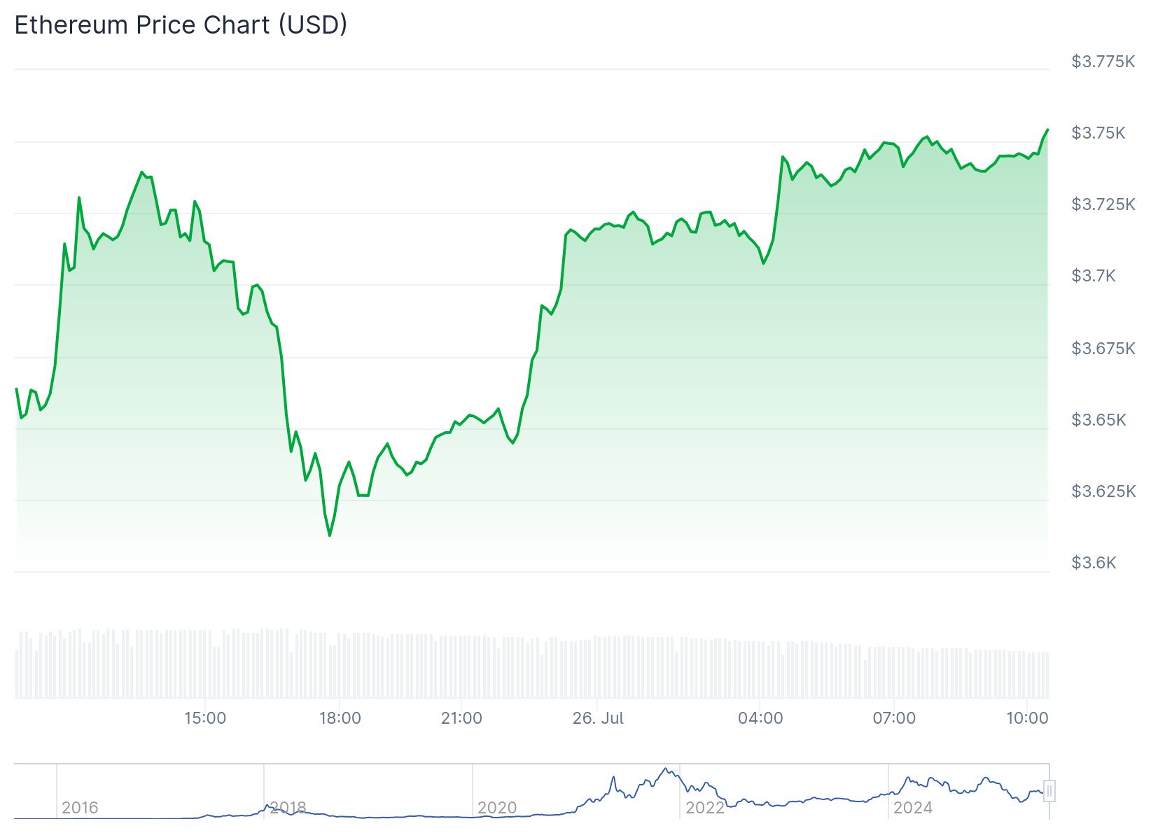 Hier, à partir de la fin de l’après-midi, les cours se sont rétablis et Ethereum est de nouveau monté à son emplacement habituel au-dessus de 3 700 dollars. Au moment de l’écriture, le roi des altcoins se négocie à 3 746 dollars.