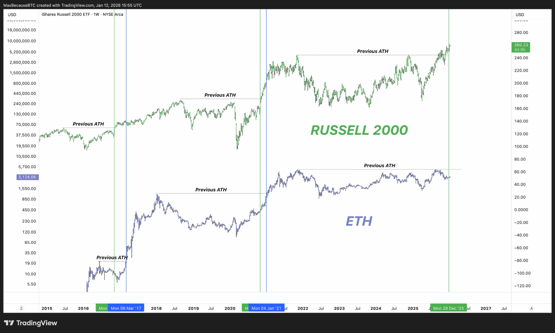 En outre, le contexte général du marché est favorable. Max, PDG de BecauseBitcoin, souligne qu’Ethereum évolue souvent en phase avec les petites actions américaines. Comme ce marché atteint de nouveaux records, il y voit un signe favorable pour l’ETH.