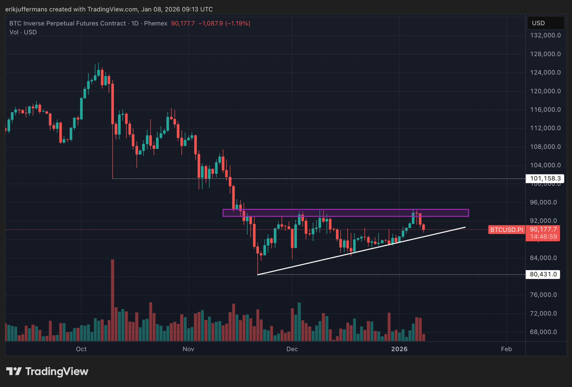 Un triangle ascendant est un modèle haussier. Tant que le cours ne sort pas par le bas de ce modèle, nous pouvons anticiper une cassure haussière et une augmentation vers 100 000 dollars. C’est le scénario haussier dominant. Cependant, une chute en dessous de la ligne de tendance pourrait ouvrir la voie vers le niveau de 80 000 dollars.