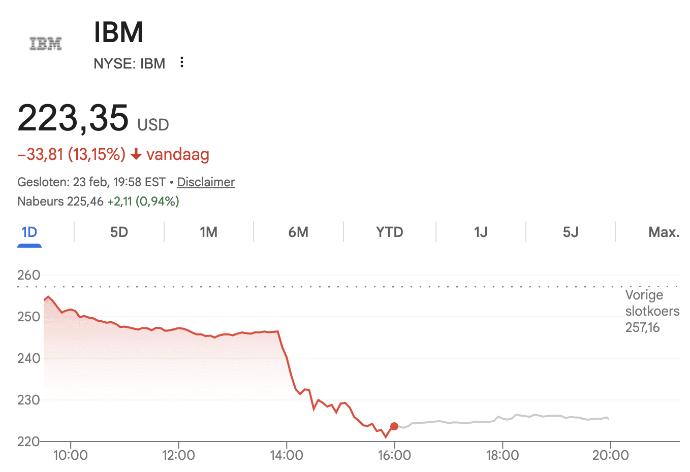IBM a terminé la journée de trading en baisse de plus de treize pour cent, sa plus forte chute journalière depuis l’an 2000. D’autres grandes entreprises ont également subi des pertes. DoorDash et American Express ont perdu plus de six pour cent. Les actions de Visa, Mastercard et Uber ont chuté de quatre pour cent ou plus.