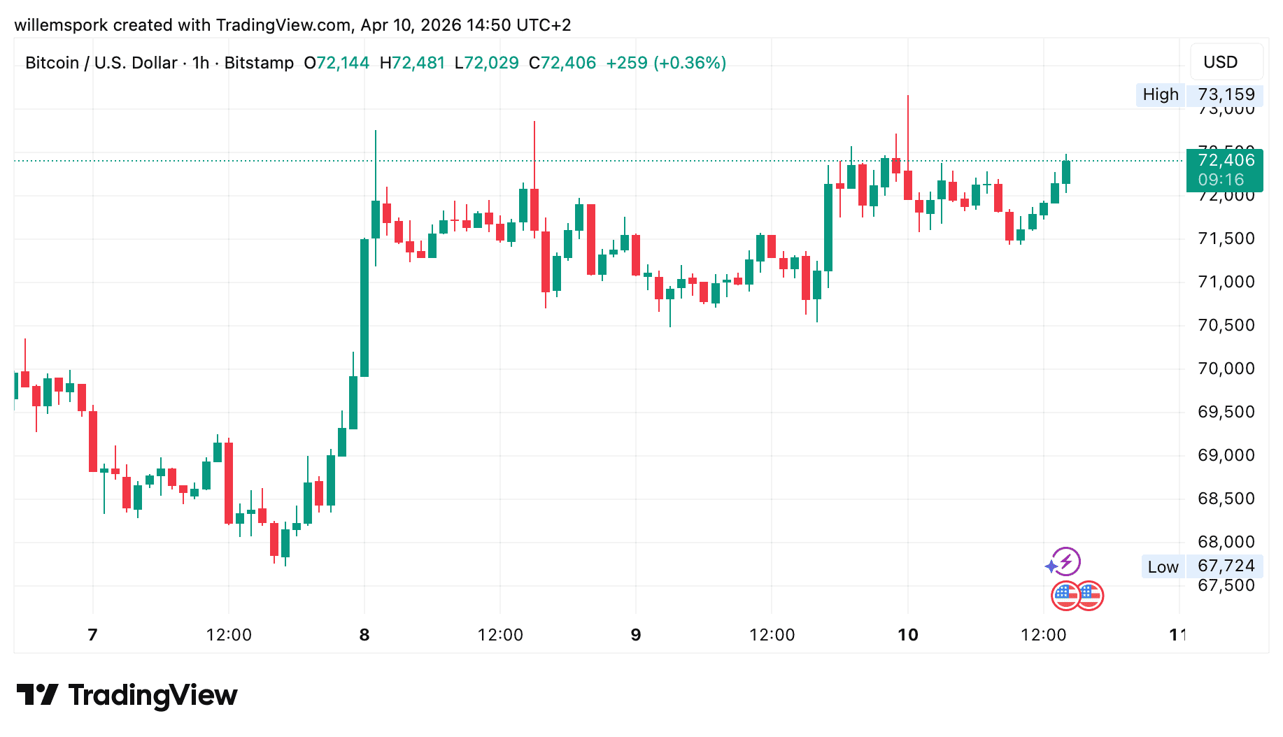 Le Bitcoin (BTC) a réagi immédiatement aux chiffres. Vers 14h30, le cours a brièvement grimpé, avant de se stabiliser autour de 72 300 dollars. Cette réaction suggère que les investisseurs ont surtout été soulagés par la baisse inattendue de l’inflation sous-jacente. Pour les cryptomonnaies, cela est pertinent car une inflation sous-jacente plus faible augmente la probabilité que la Fed reste prudente pour l’instant, même si l’inflation générale demeure élevée.