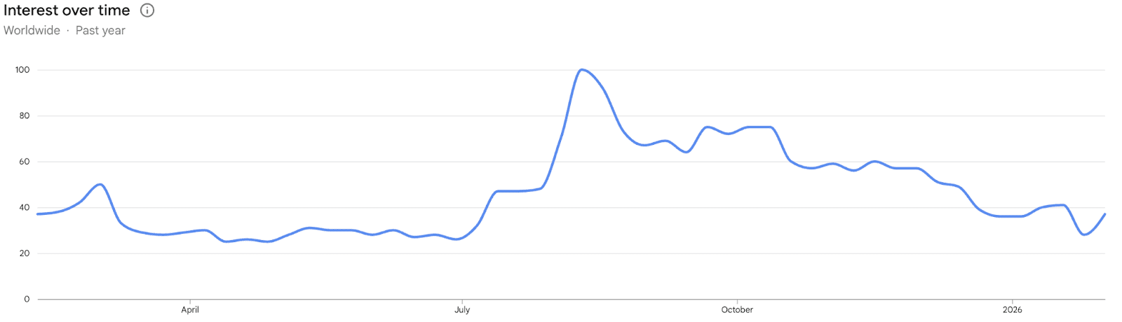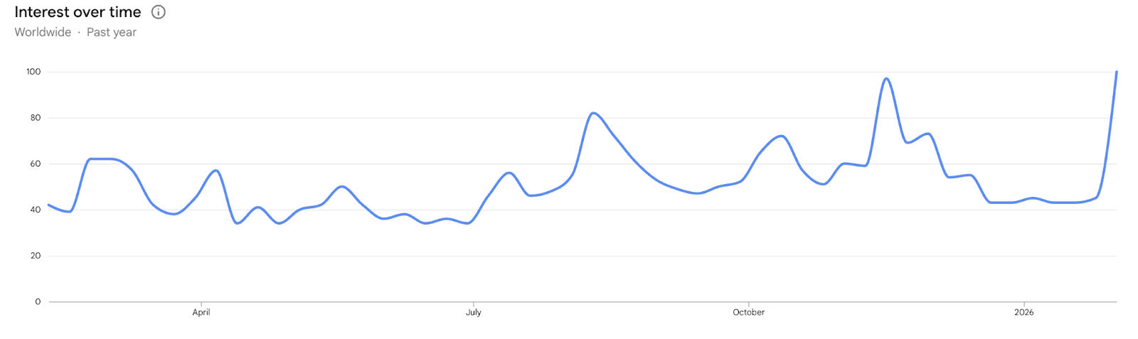 La valeur de Google Trends indique la fréquence relative de recherche d’un mot-clé donné sur une certaine période et région. Il ne s’agit pas de chiffres absolus, mais de proportions par rapport au moment le plus actif.