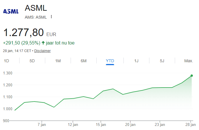 De plus, les résultats trimestriels d’ASML ont largement dépassé les attentes des analystes. L’action a déjà augmenté de plus de quarante pour cent ce mois-ci. C’est le plus grand gain mensuel en plus de vingt ans.