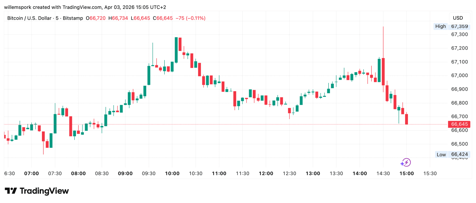 Le cours du Bitcoin a montré de fortes variations lors de la publication des chiffres. Le BTC a d’abord bondi vers 67 300 dollars avant de subir un rejet marqué. Peu après, le cours a chuté à environ 66 600 dollars, où il se stabilise au moment de l’écriture.