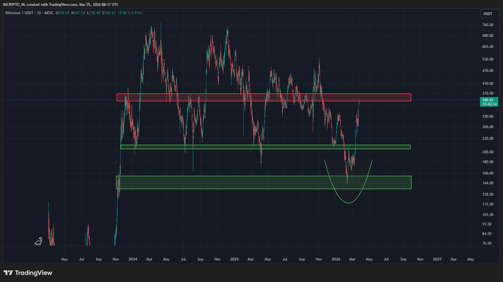Au cours des dernières 24 heures, le cours de Bittensor a augmenté de 9,58 %. L’altcoin se négocie désormais à plus de 343 dollars, alors qu’il était encore à 302 dollars hier.
