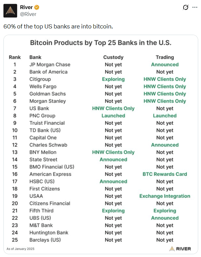Plus de la moitié des plus grandes banques américaines proposent désormais des services liés au Bitcoin (BTC) ou ont annoncé des projets en ce sens. C’est ce qu’indique un rapport de l’entreprise américaine spécialisée dans le Bitcoin, River, affirmant que 60 % des 25 plus grandes banques sont activement engagées dans le Bitcoin.