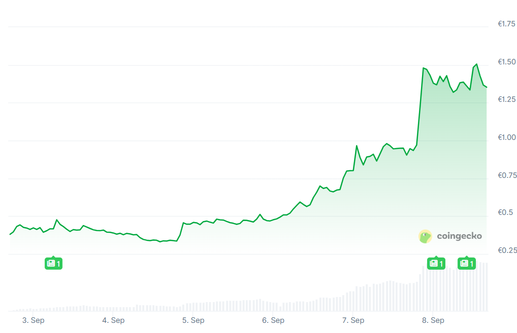 La monnaie numérique n’existe que depuis le 2 septembre. Peu après son lancement, SOMI a chuté à un creux d’environ 0,335 euro, mais cette correction a été de courte durée. Aujourd’hui, le token a atteint un sommet historique de 1,51 euro, une hausse sans précédent de 351 pour cent depuis son introduction.