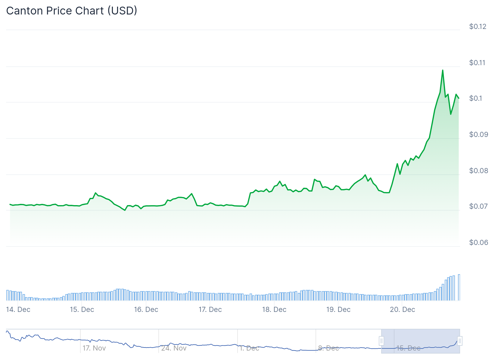 La cryptomonnaie relativement méconnue Canton (CC) a connu aujourd’hui une hausse explosive. En 24 heures, le prix a grimpé de 33 %. L’intérêt semble principalement suscité par une décision marquante d’un géant financier.