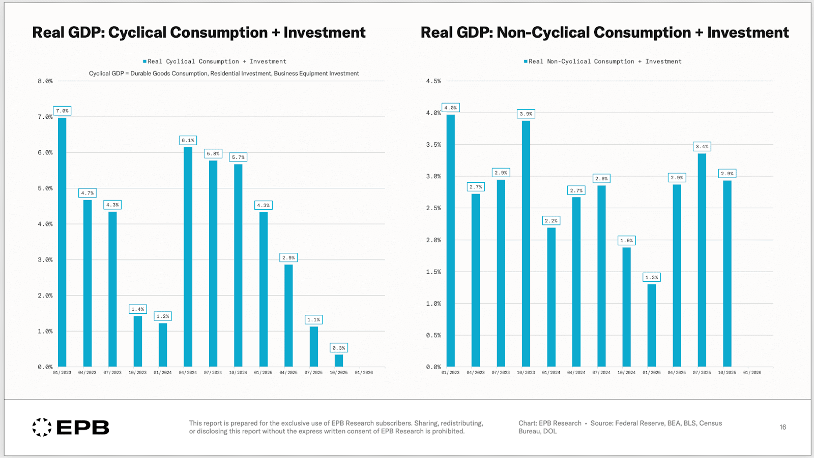 Ensemble, ces catégories constituent ce que EPB appelle la partie cyclique du PIB. Ces éléments représentent environ 20 % de l’économie, mais ont historiquement été responsables de toutes les récessions.