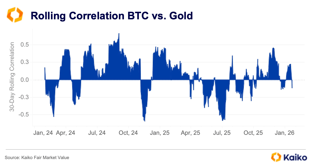 Bitcoin (BTC) est souvent qualifié d’or numérique, mais en examinant sa corrélation avec le métal précieux, cette notion semble infondée. La corrélation représentée dans le graphique de Kaiko montre même que la relation entre Bitcoin et l’or est totalement imprévisible.