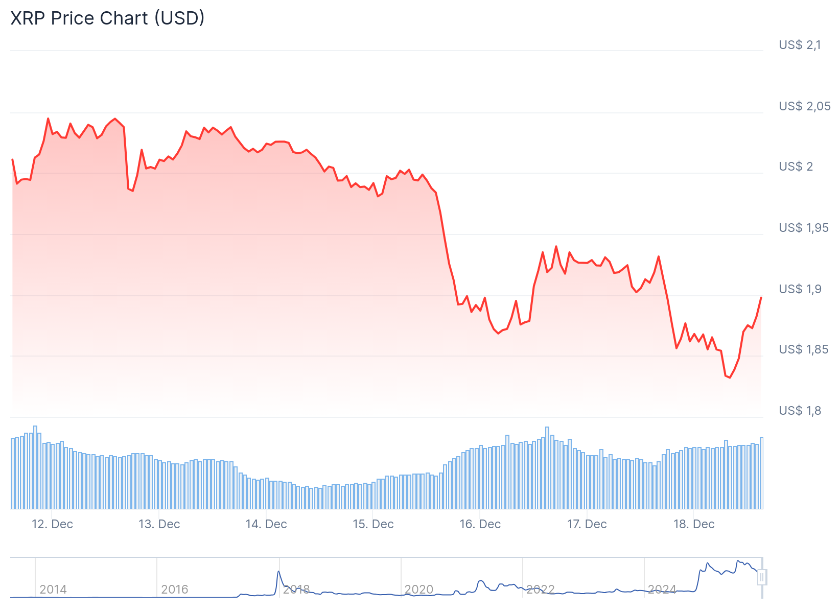 Au moment de l’écriture, le cours du XRP s’élève à environ 1,90 dollar, après une baisse hebdomadaire de 6,8 %. Cela place le cours bien en dessous du sommet historique de juillet, atteint à 3,65 dollars.