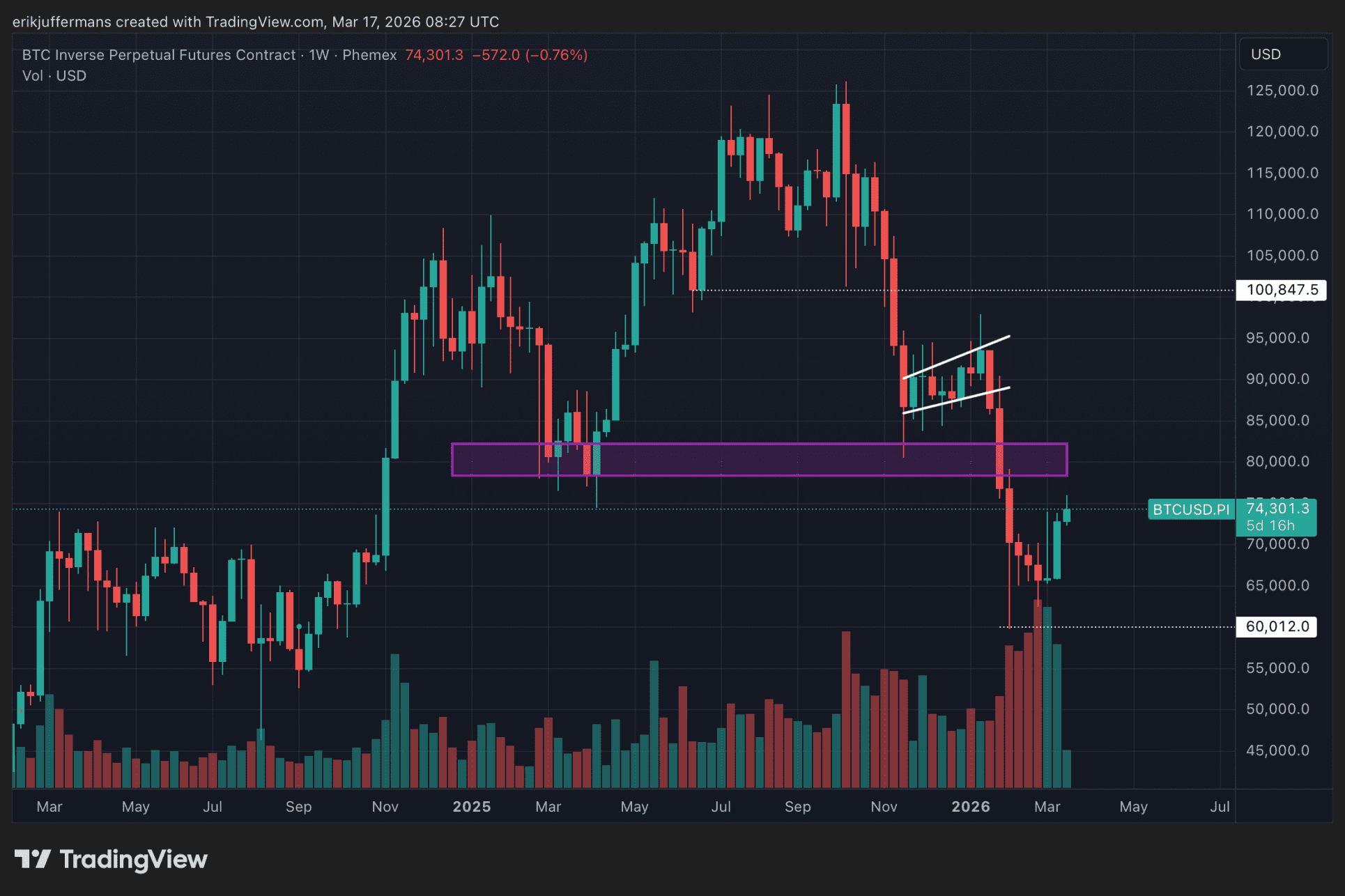 Le cours a affiché huit bougies vertes consécutives. Aujourd’hui, il semble se stabiliser après avoir atteint un pic de 76 000 dollars, son niveau le plus élevé depuis le 4 février. Le cours a franchi un seuil de résistance important (la zone inférieure violette) et la zone de résistance autour de 80 000 dollars semble devenir un objectif réaliste.