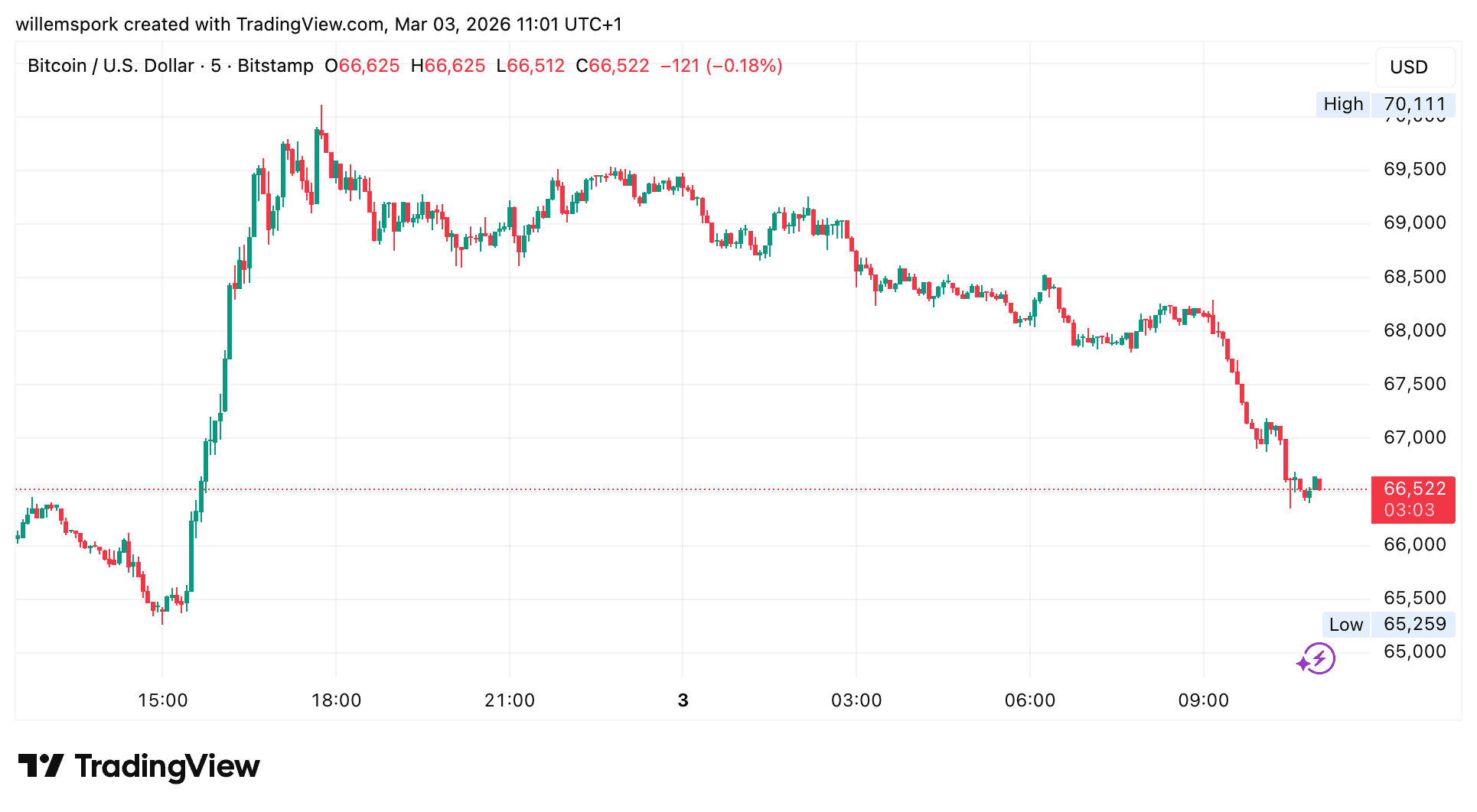 Sur le graphique à court terme, on observe que le Bitcoin est passé rapidement de plus de 69 000 dollars à environ 66 500 dollars. Une cassure nette sous les 66 000 dollars pourrait ouvrir la voie à des niveaux inférieurs autour de 64 000 dollars.
