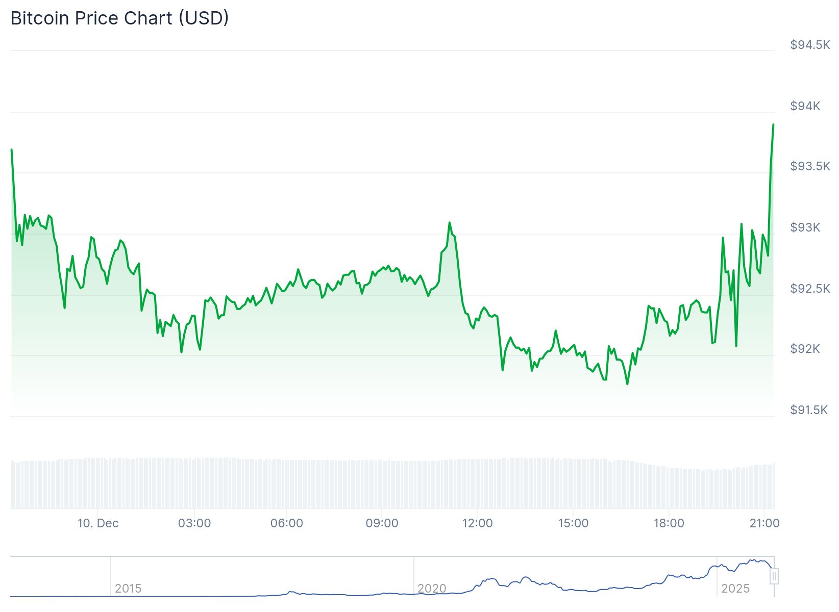 Pendant que Powell parlait, le Bitcoin a oscillé plusieurs fois, mais finalement, ce sont les haussiers qui l’ont emporté. À l’heure actuelle, il se situe juste en dessous de 94 000 dollars, légèrement plus haut qu’il y a 24 heures.