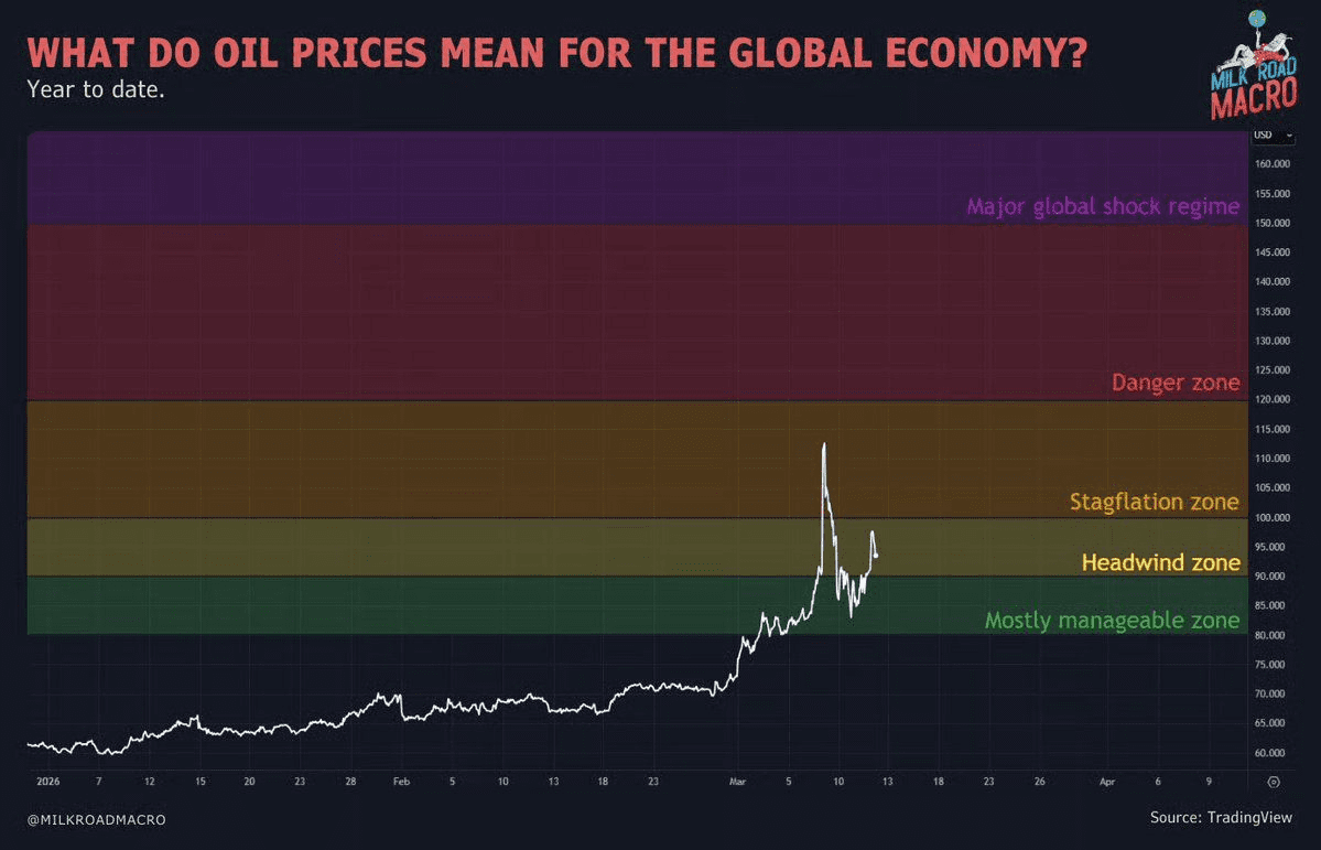 Les analystes de Milk Road Macro se sont ensuite penchés sur les implications potentielles de certains niveaux de prix du pétrole pour l’économie mondiale.