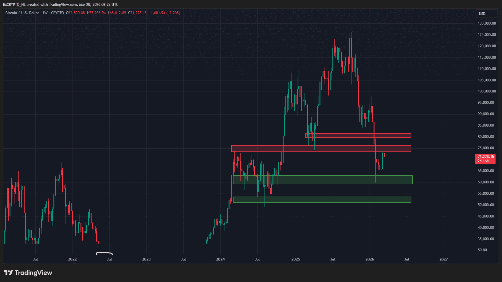 Jetons également un coup d’œil au graphique hebdomadaire pour mieux comprendre les objectifs de prix. Autour de 76 000 dollars, il y a une forte résistance, et le Bitcoin doit également faire face à la limite supérieure du canal.