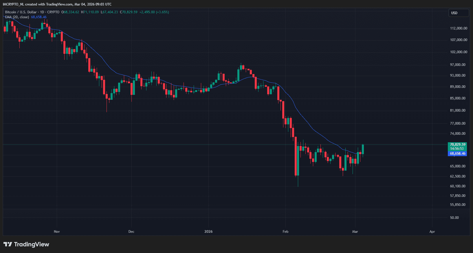 Tôt ce matin, le Bitcoin évoluait encore autour de 67 500 dollars, mais il affiche désormais 71 000 dollars. Cela représente une augmentation spectaculaire de plus de 5 %. C’est également le niveau le plus élevé depuis le 9 février.