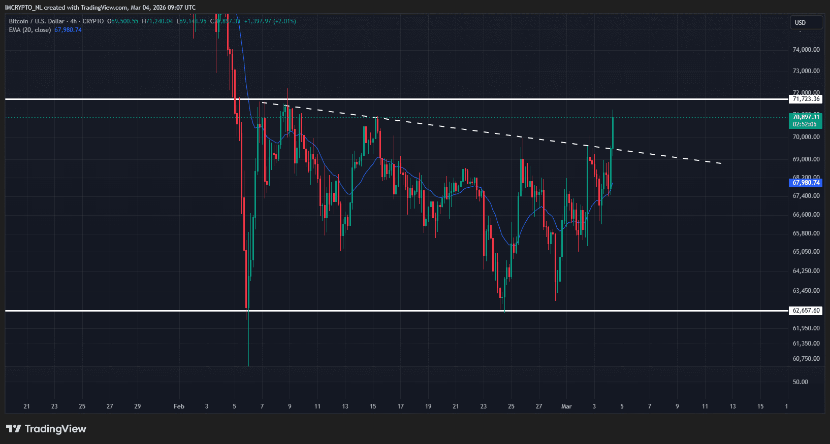 La véritable clé réside dans les 71 800 dollars, soit la ligne de résistance horizontale supérieure du graphique ci-dessous. Si ce seuil est franchi, une nouvelle hausse vers les 80 000 dollars est envisageable. En cas de rejet, un retour vers la ligne pointillée autour de 69 000 dollars pourrait se produire.