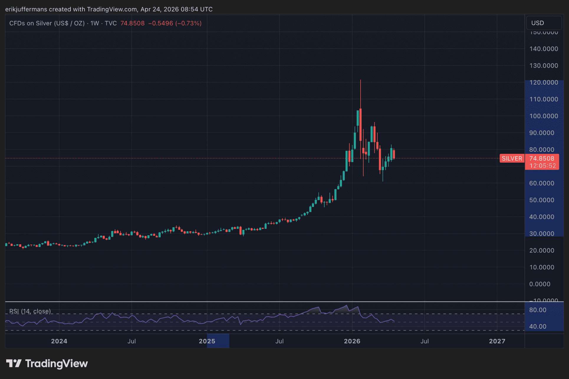 Après le pic, l’argent a rapidement perdu la moitié de sa valeur, et le cours est désormais environ 38 % plus bas.