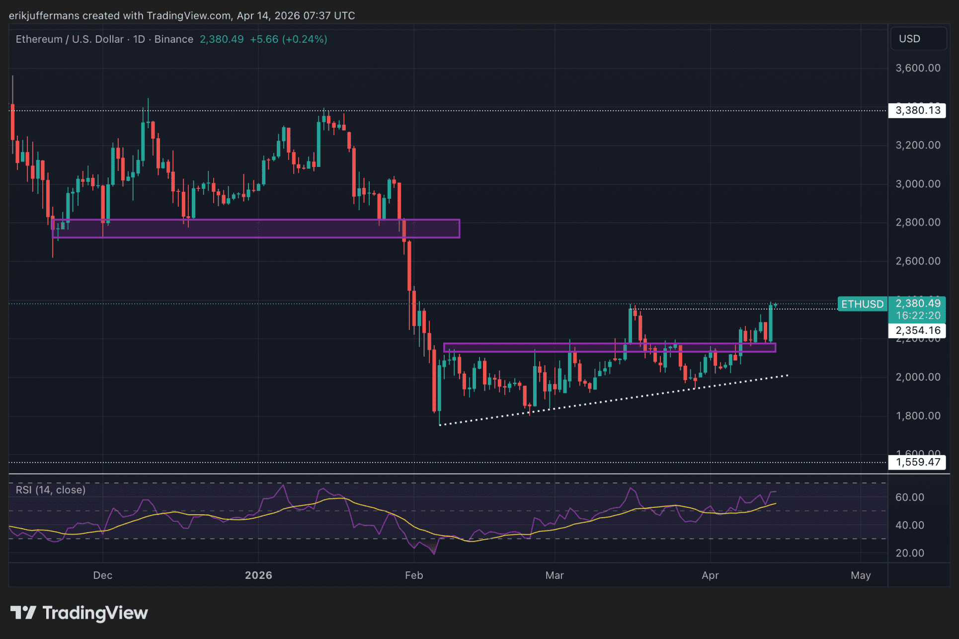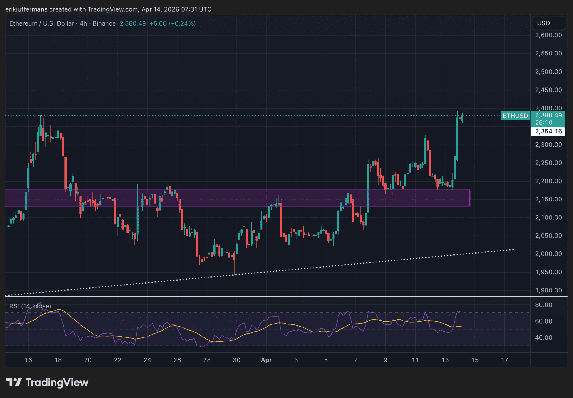 Hier après-midi, l’ETH a amorcé sa hausse à partir de 2 170 dollars et se négocie désormais à 2 380 dollars, dépassant ainsi le récent pic du 16 mars. On peut donc officiellement parler d’un plus haut supérieur. De plus, le cours actuel est le plus élevé depuis le 1er février. Quelle est la suite ?