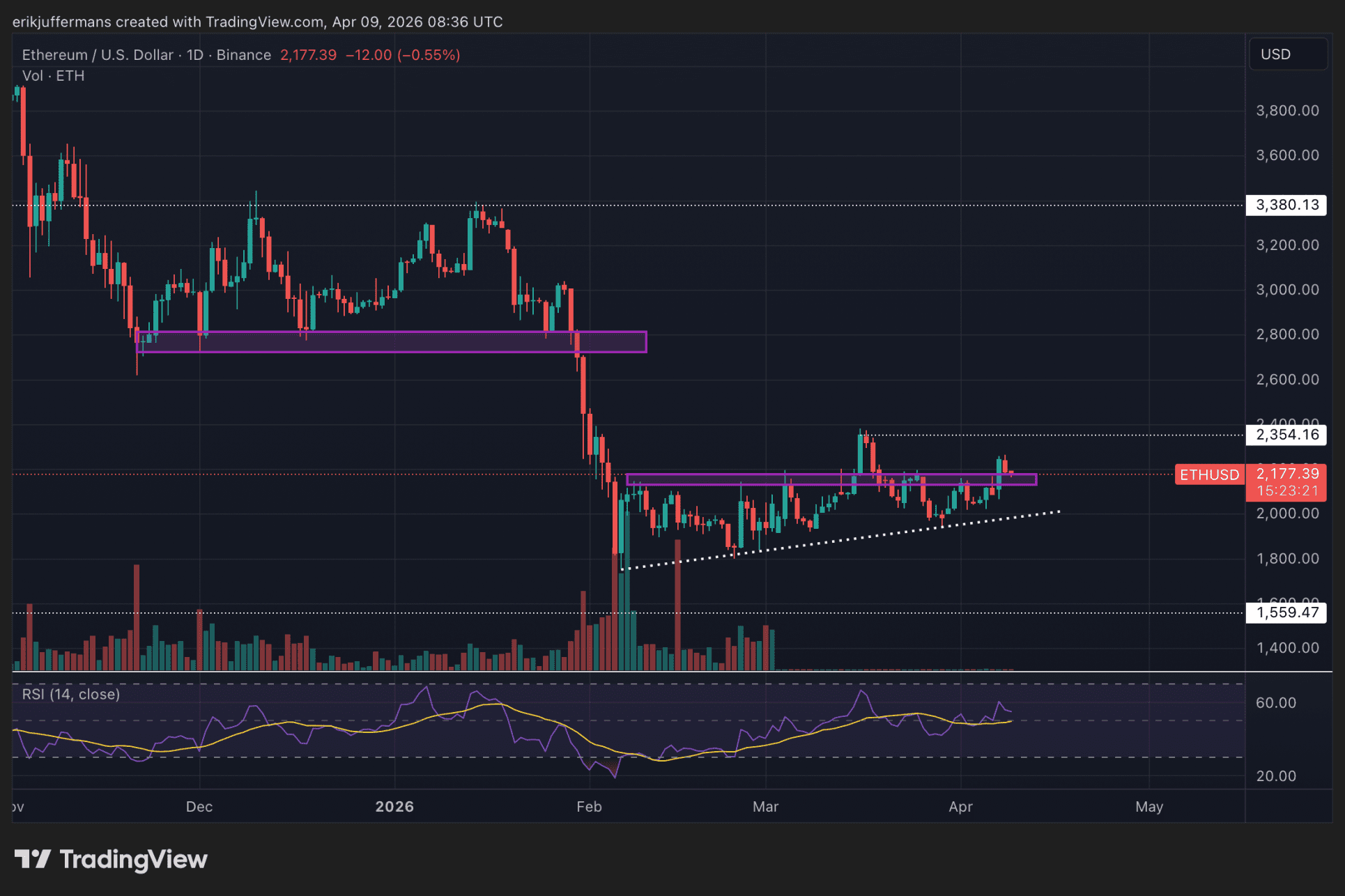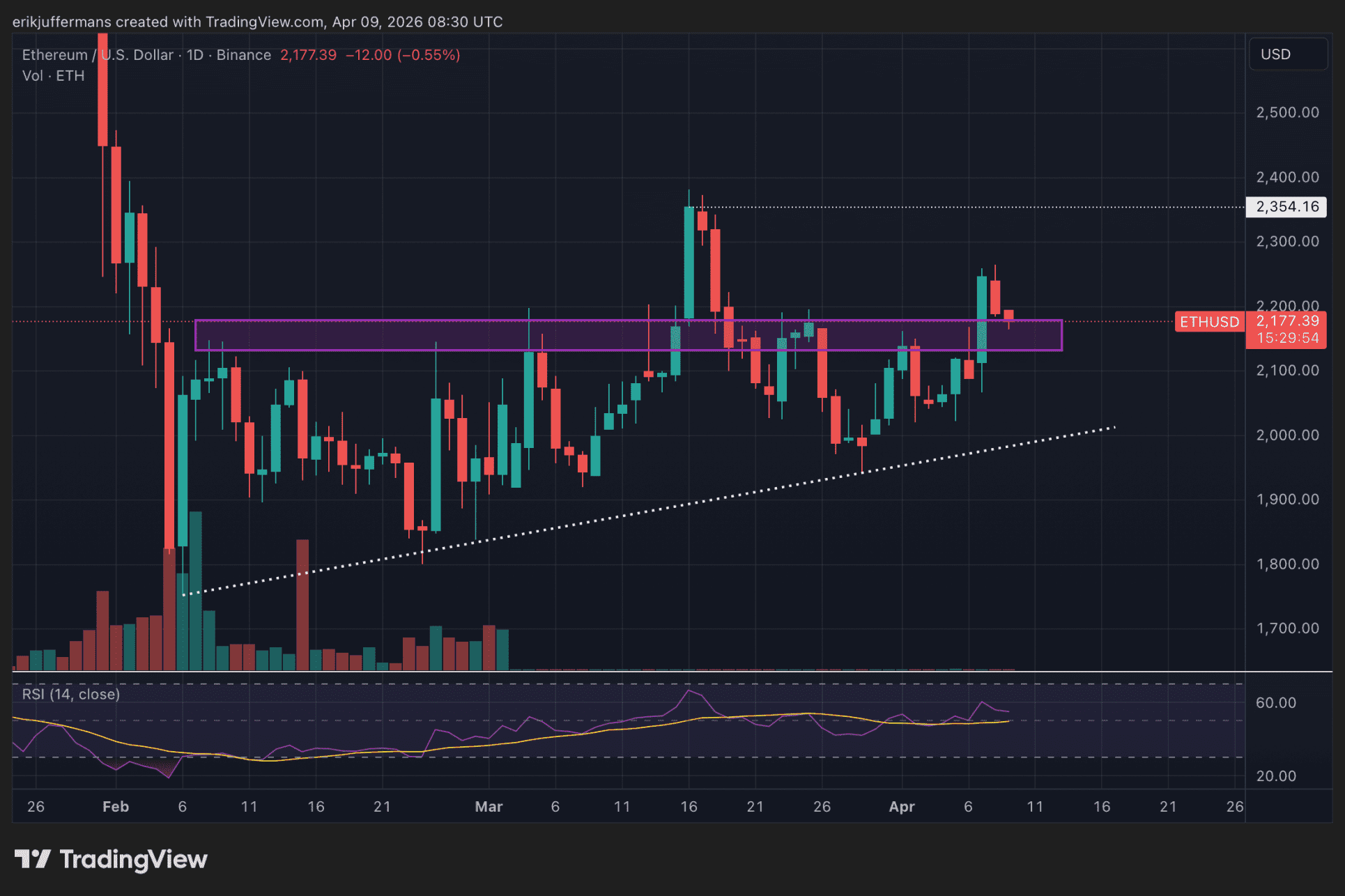 Mardi, l’ETH a bondi de plus de 8 %, atteignant un sommet de 2 250 dollars. Sur le graphique journalier ci-dessous, on constate que cette hausse a permis de franchir la zone de résistance violette. Actuellement, le cours recule légèrement et semble tester cette zone de résistance violette en tant que support.