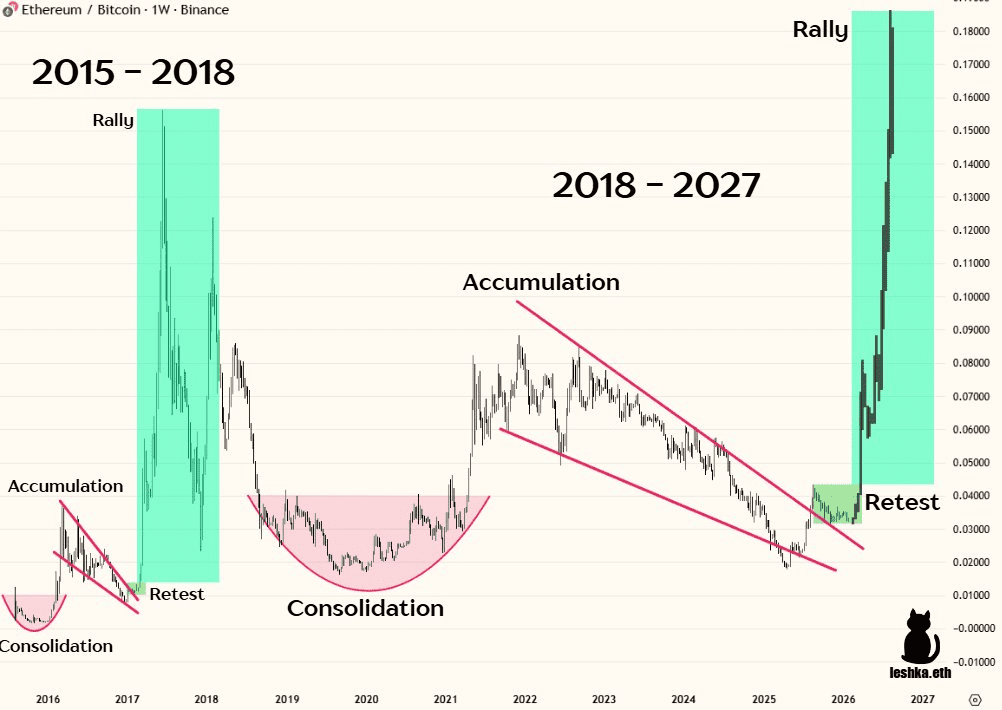 “L’ETH va tripler voire quadrupler au cours des six prochains mois,” écrit-il sur X. Avec le cours actuel d’environ 2 950 dollars, cela pourrait équivaloir à un objectif de près de 12 000 dollars. Leshka compare la structure graphique actuelle à celle de 2015 à 2018, période où l’ETH est passé de 56 à 1 151 dollars. Il estime néanmoins que la base actuelle est encore plus solide.