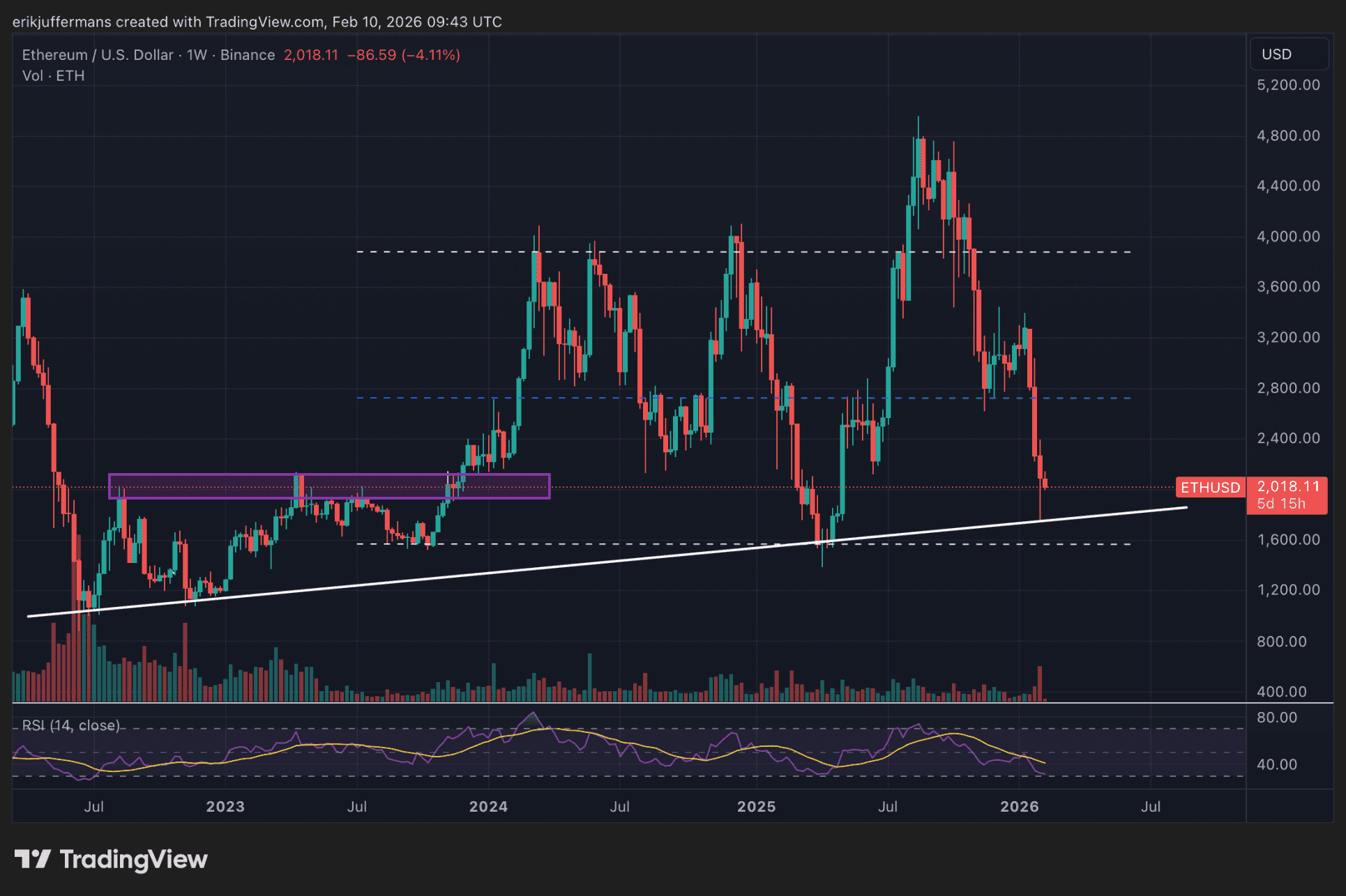 Le graphique hebdomadaire apporte beaucoup plus de clarté. Ce que l’on remarque immédiatement, c’est que la récente baisse à 1 800 dollars n’était pas une coïncidence. Le cours a précisément touché une ligne de support diagonale significative depuis l’été 2022.