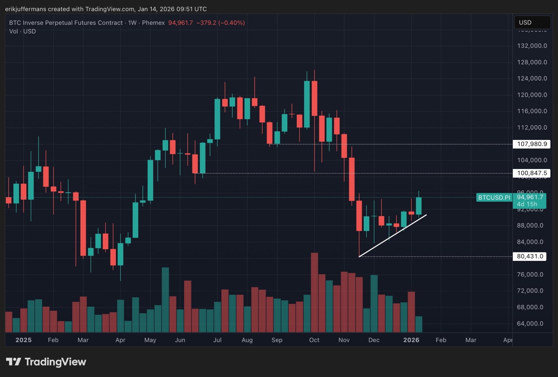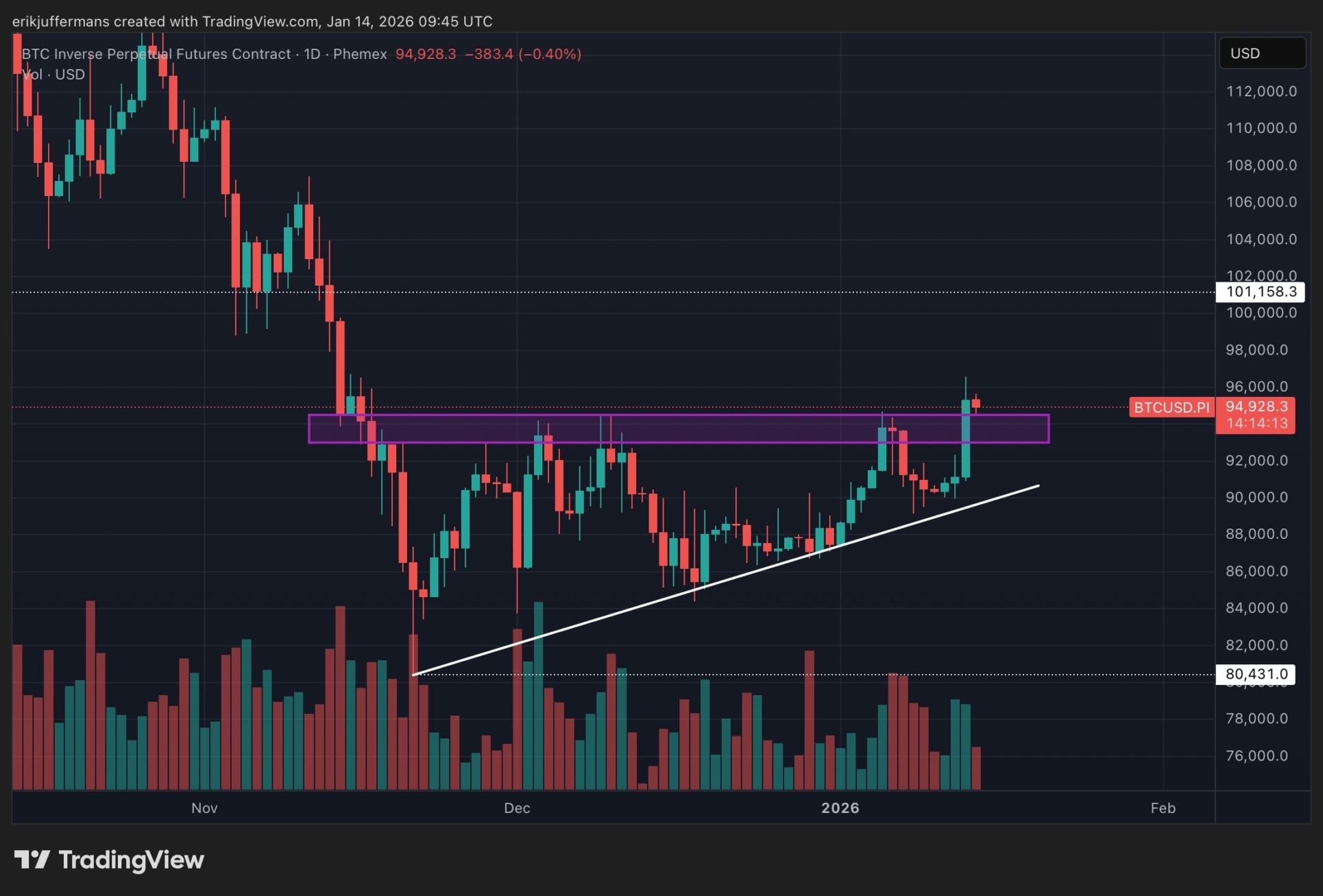 Dans nos analyses précédentes, nous avions déjà discuté des deux options possibles pour le BTC : une hausse à travers la zone de résistance violette entre 93 500 et 94 500 dollars ou une baisse à travers la ligne de tendance diagonale. Avec la hausse d’hier soir à 96 000 dollars, le premier scénario s’est réalisé.